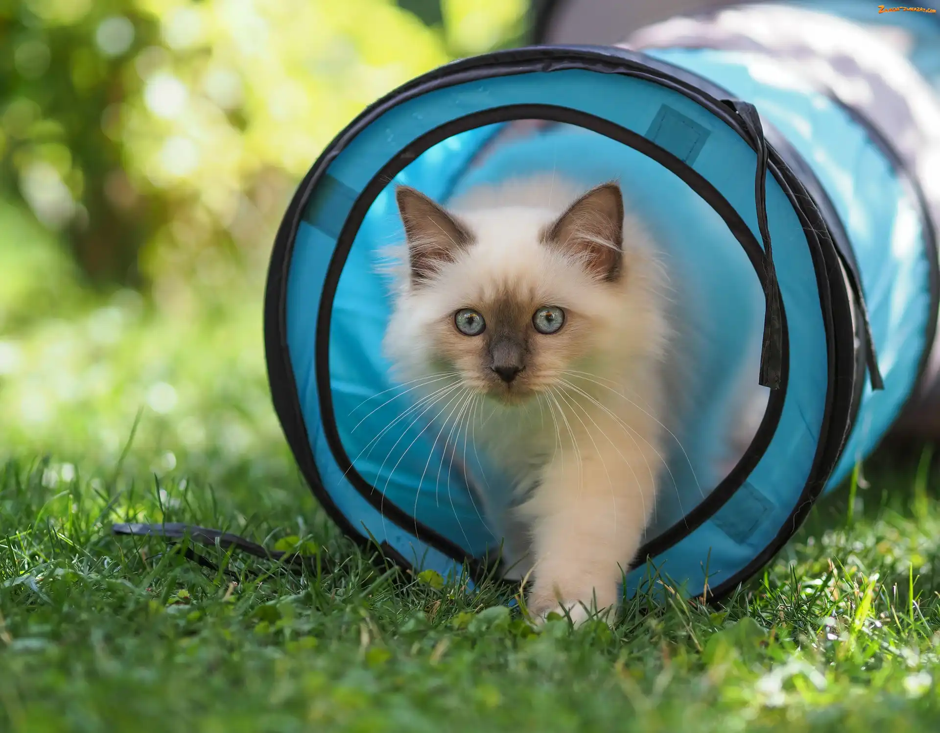 Zdjęcie: Tunel, Niebieski, Trawa, Puszysty, Rozmycie, Kot ragdoll, Oczy, Niebieskie