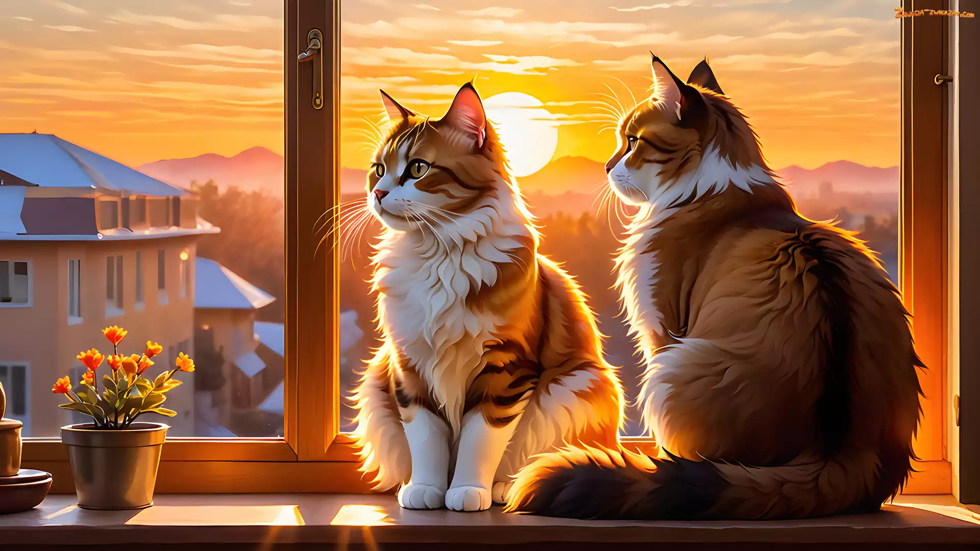 Zachód słońca, Okno, 2D, Dwa, Koty