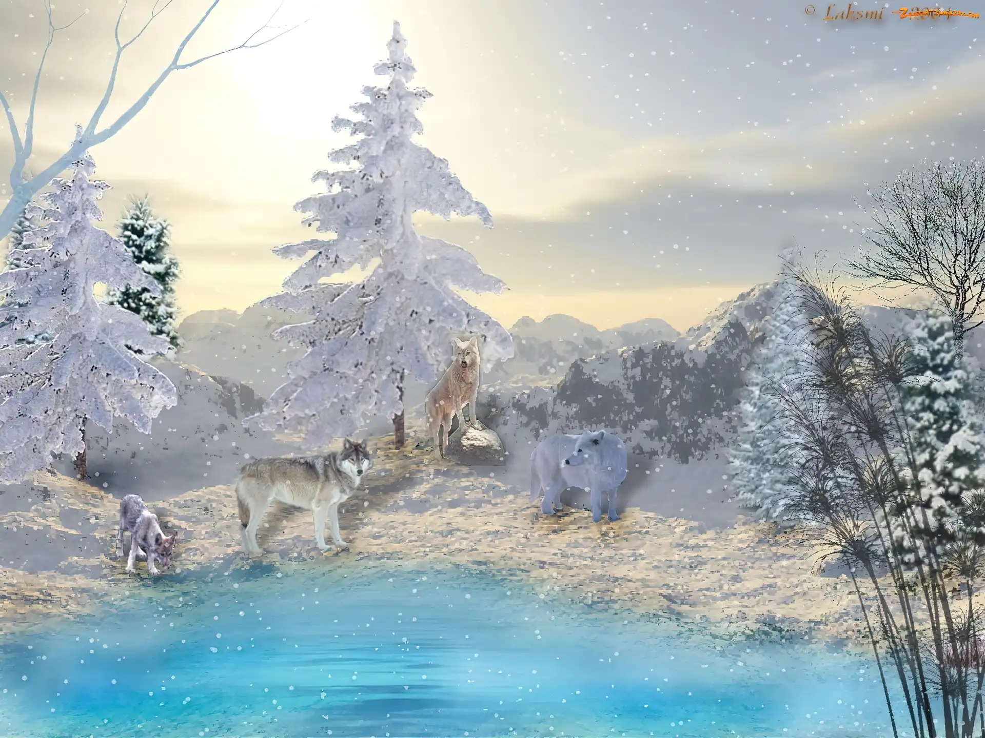 Zdjęcie: 3D, Las, Wilki, Zima, Rzeka