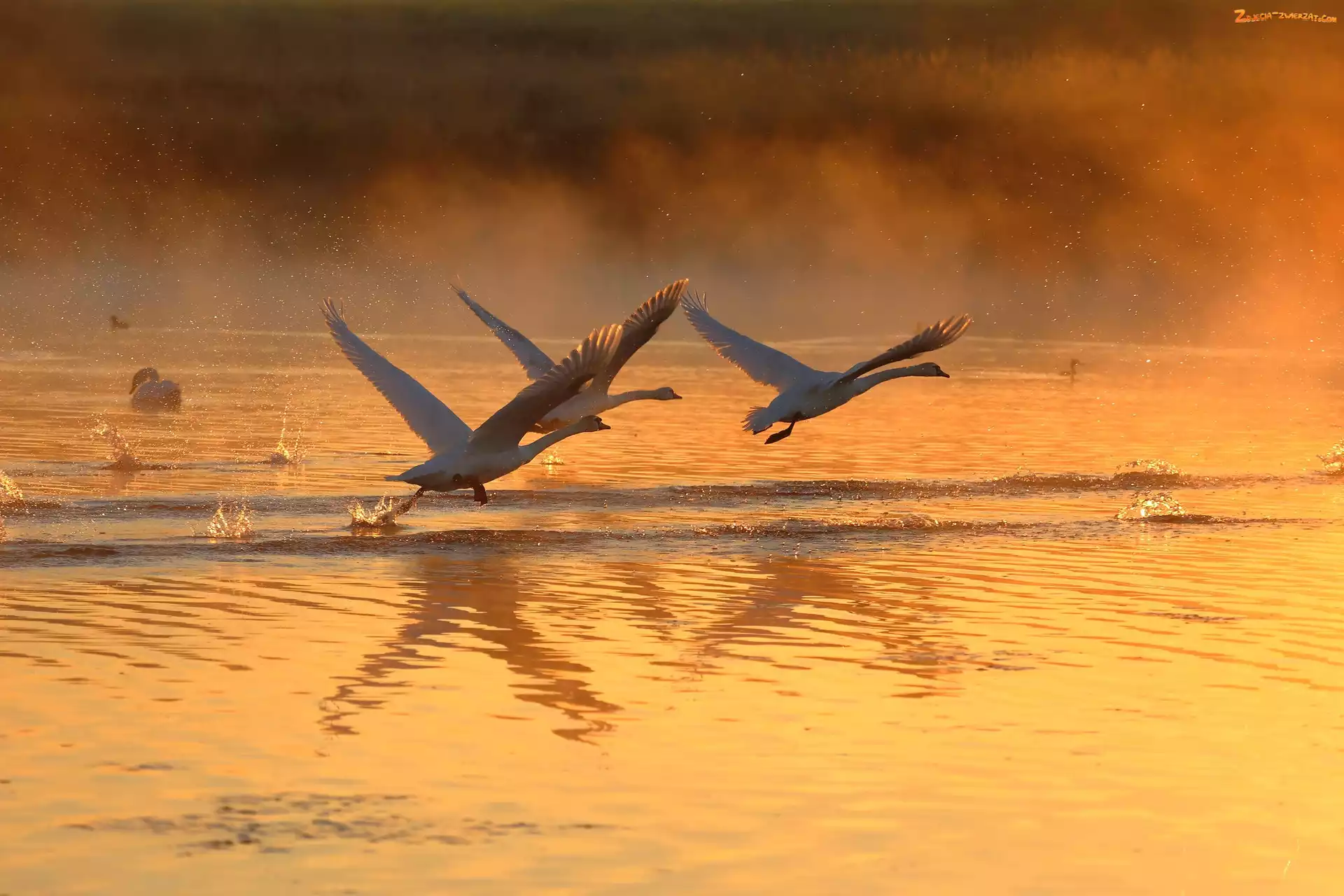 Zdjęcie: Łabędzie, Ptaki, Jezioro, Zachód słońca, Mgła