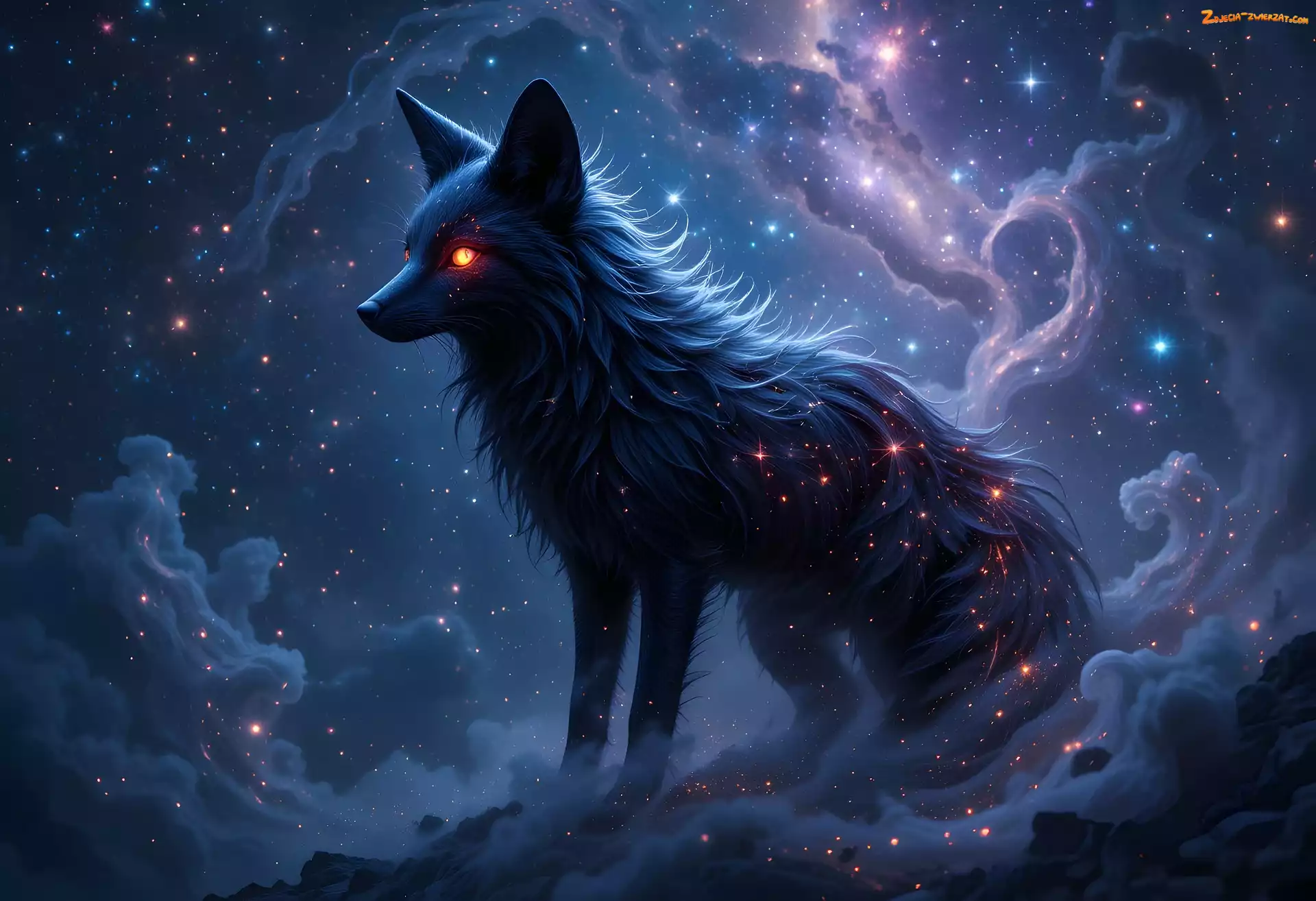 Zdjęcie: Gwiazdki, Punkciki, Dzikie, Chmury 3D, Wilk, Abstrakcja, Światełka, Wektorowa, 2D, Ssak, Sierść, Drapieżne, Czarny, Niebo, Zwierzę |