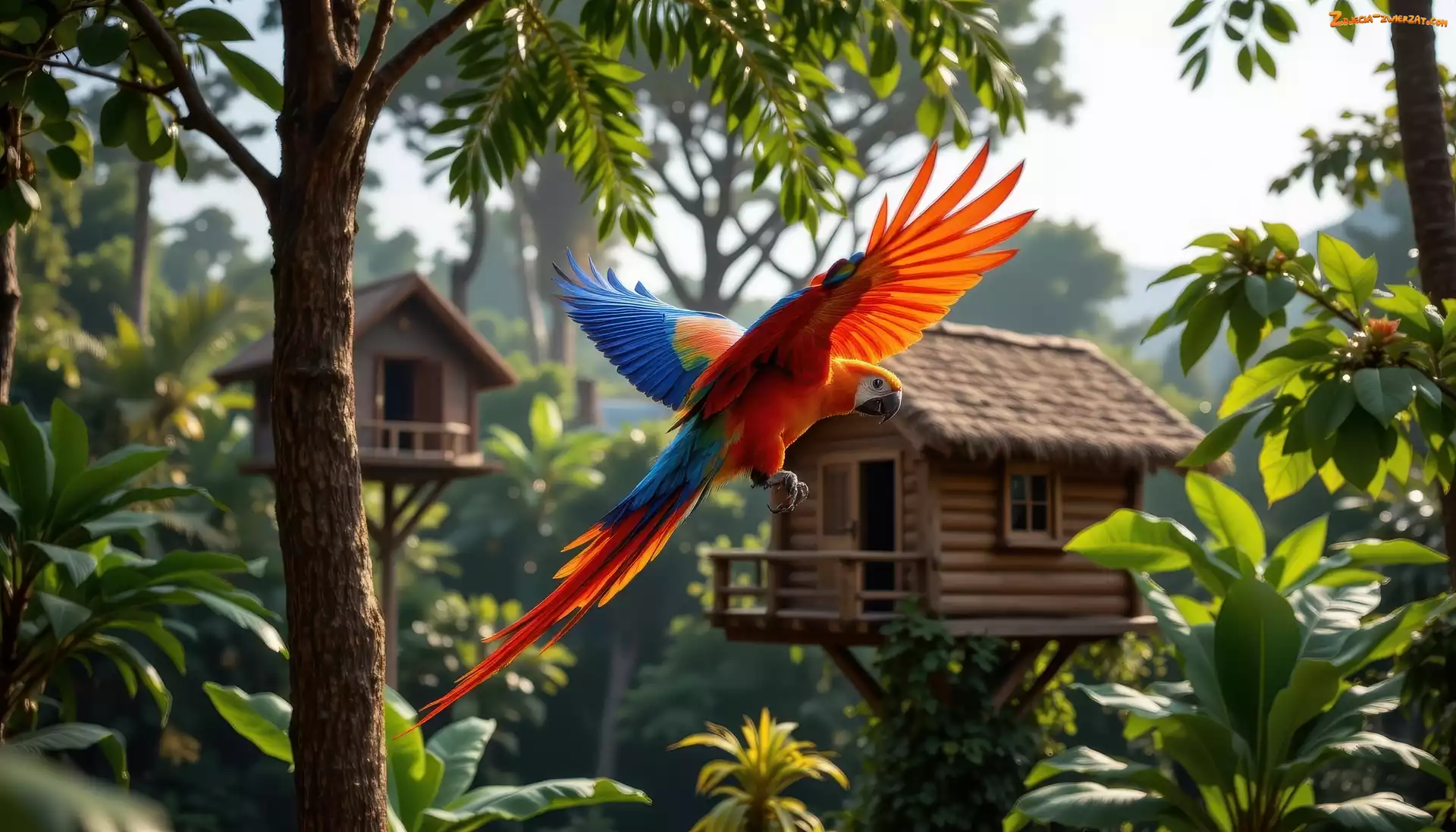 Zdjęcie: Domki, Drzewa, Grafika AI, Papuga, Ara