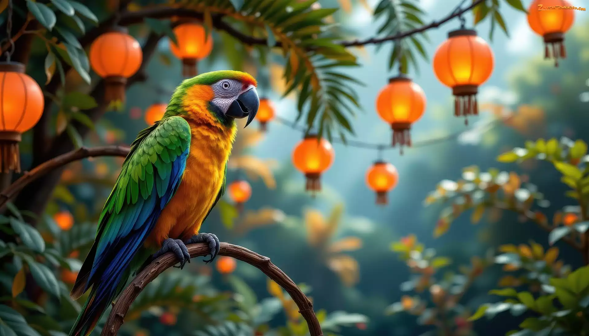 Zdjęcie: Lampiony, Gałąź, Grafika AI, Papuga, Ara