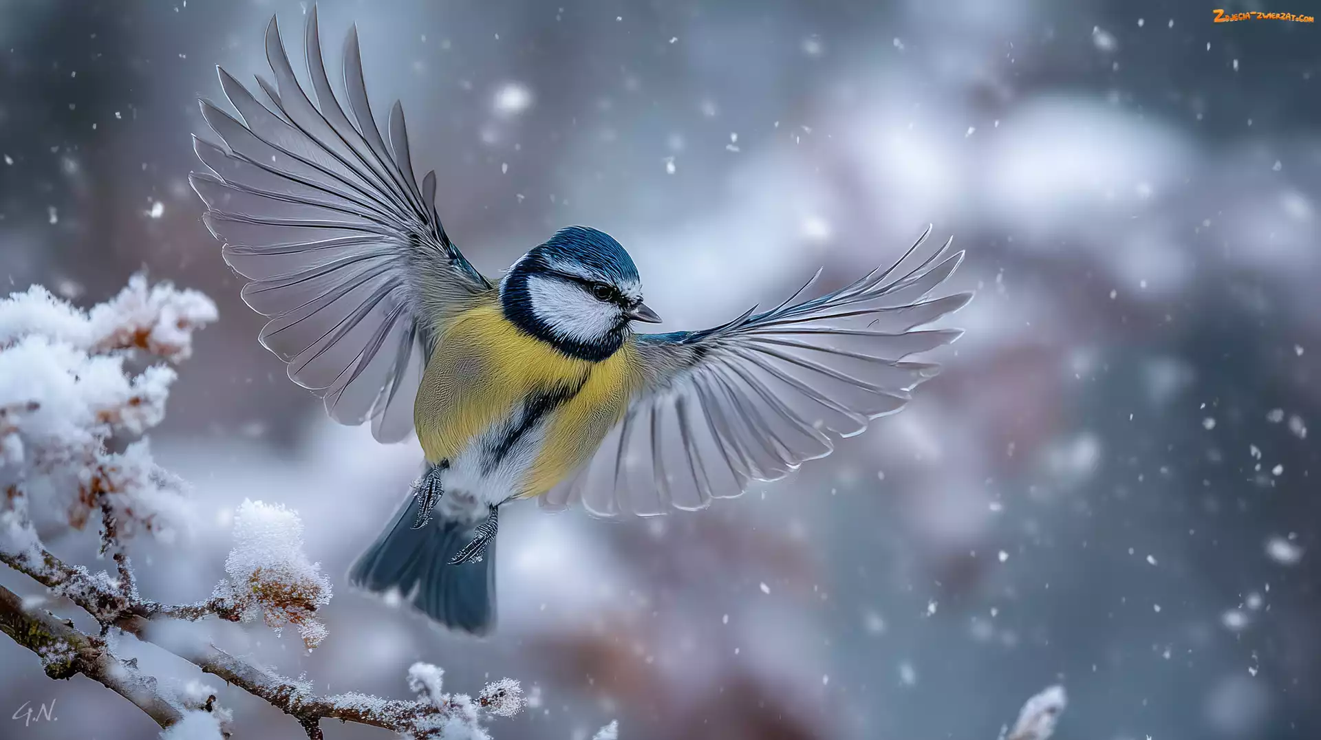 Zima, Gałązka, Grafika AI, Sikora modraszka, Skrzydła