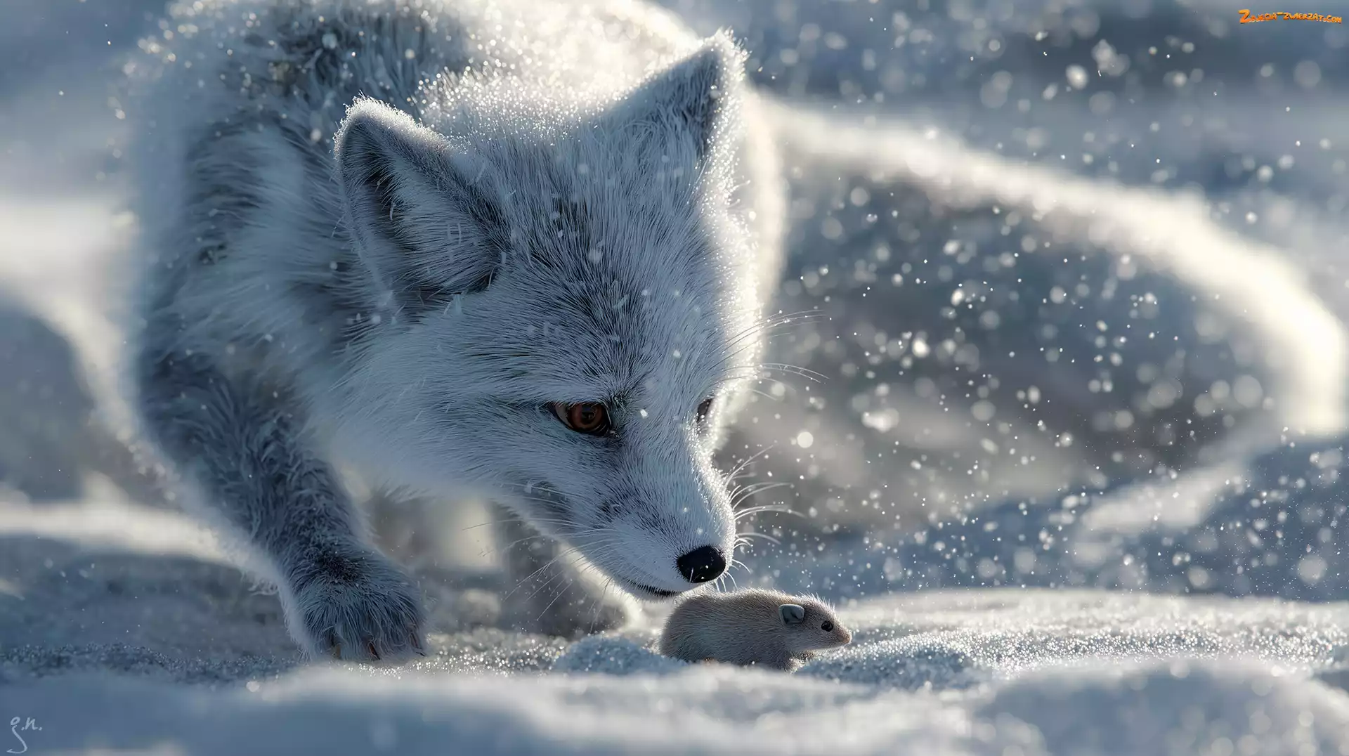 Zdjęcie: Zima, Śnieg, Grafika AI, Lis polarny, Mysz