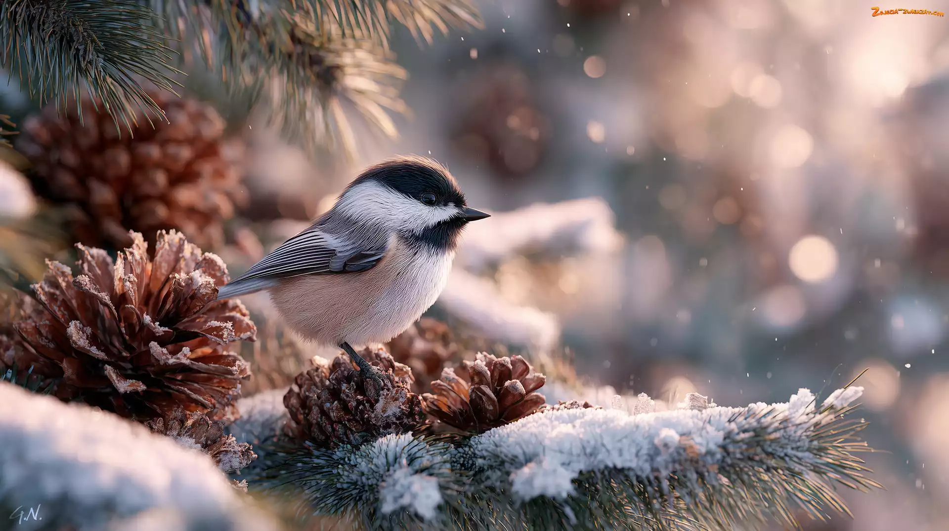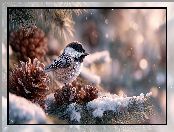Zdjęcie: Zima, Sosna, Grafika AI, Sikorka czarnogłówka, Szyszki
