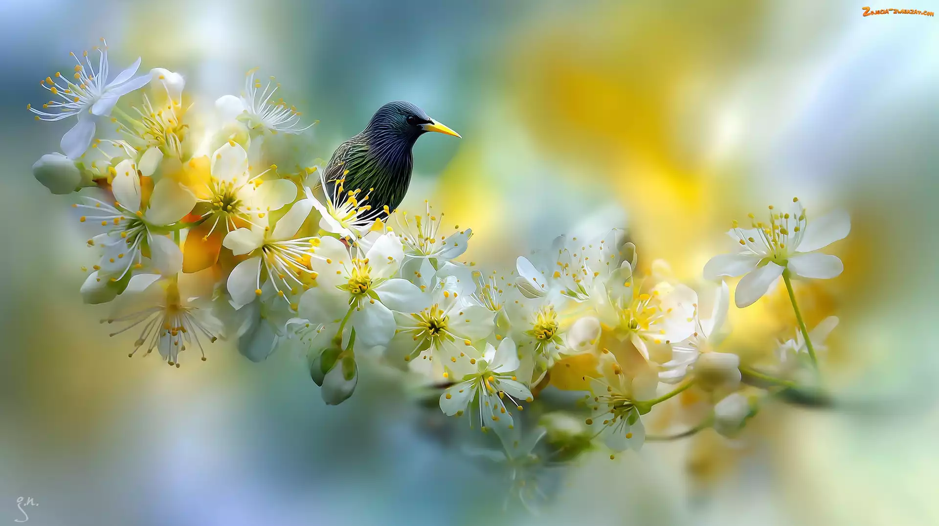 Ptak, Szpak, Grafika AI, Kwiaty, Drzewo owocowe