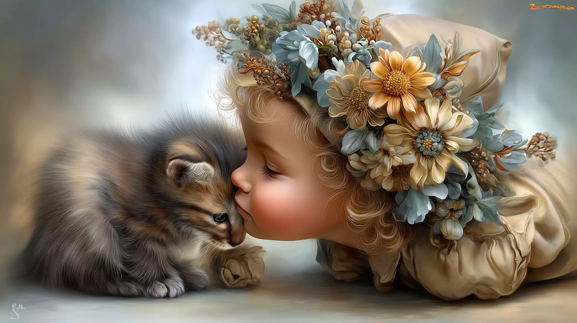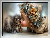 Zdjęcie: Kwiaty, Dziewczynka, Grafika AI, Mały, Kot