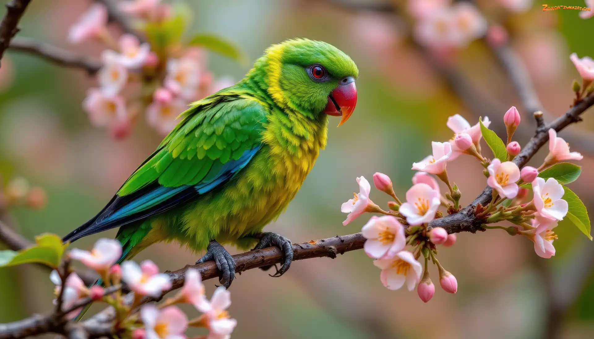 Zdjęcie: Gałązka, Kwiaty, Grafika AI, Zielona, Papuga