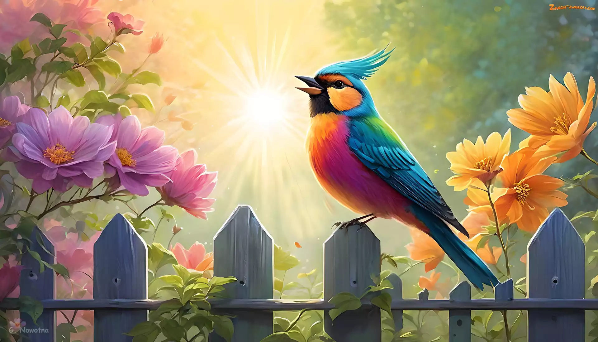Zdjęcie: Płot, Kwiaty, Grafika AI, Kolorowy, Ptak