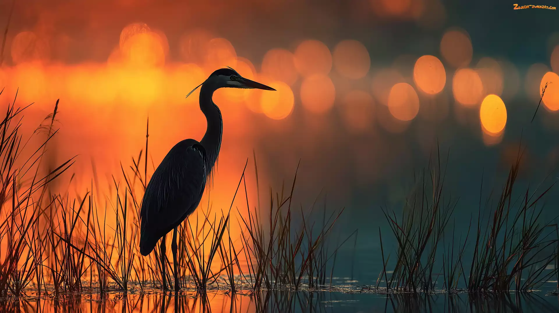 Zdjęcie: Czapla, Trawa, Grafika AI, Zachód słońca