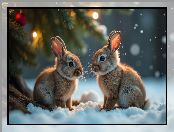 Króliki, Dwa, Grafika AI, Zima, Śnieg
