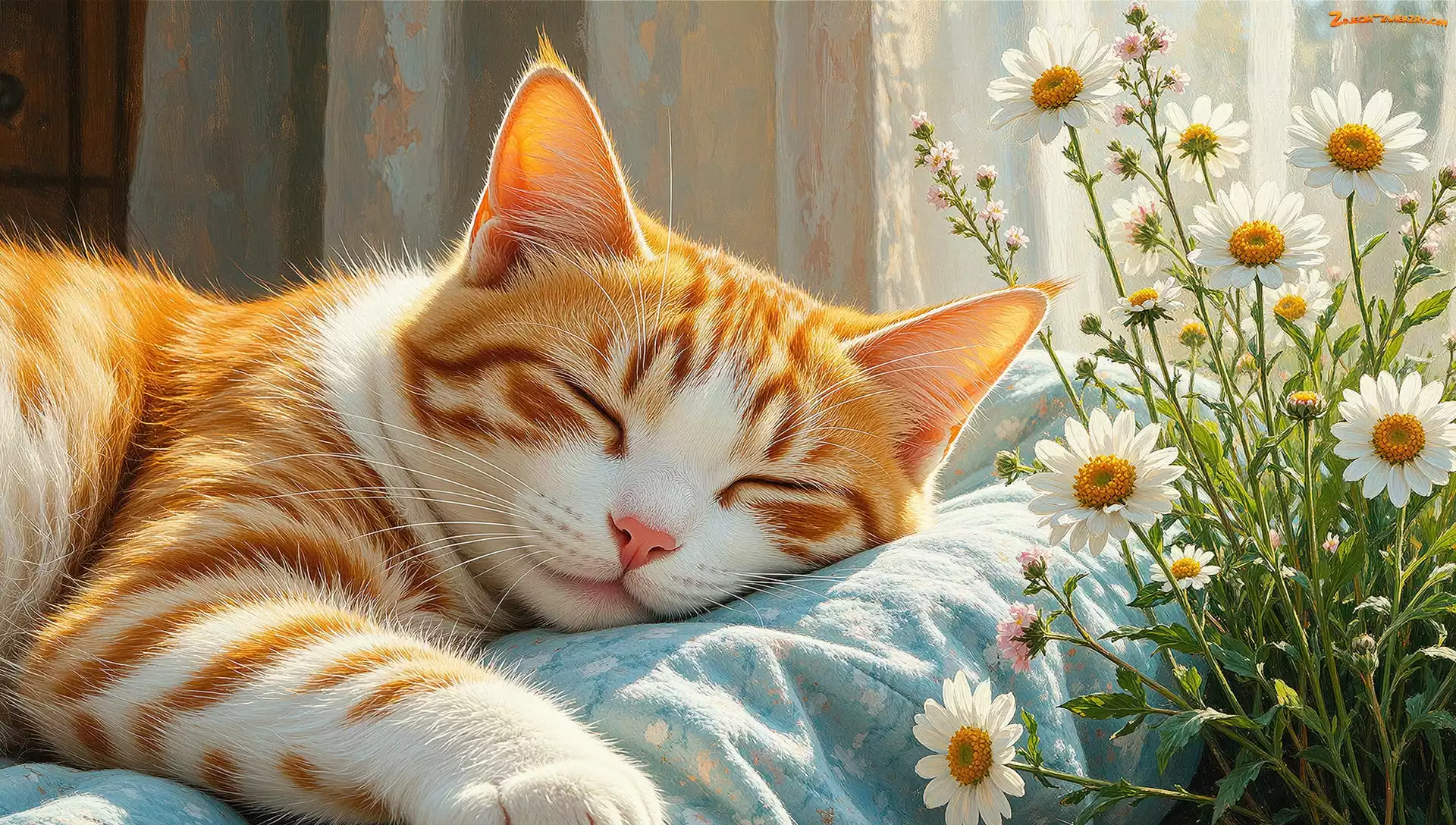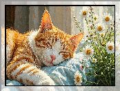 Zdjęcie: Kwiaty, Kot, Grafika AI, Rudy, Śpiący