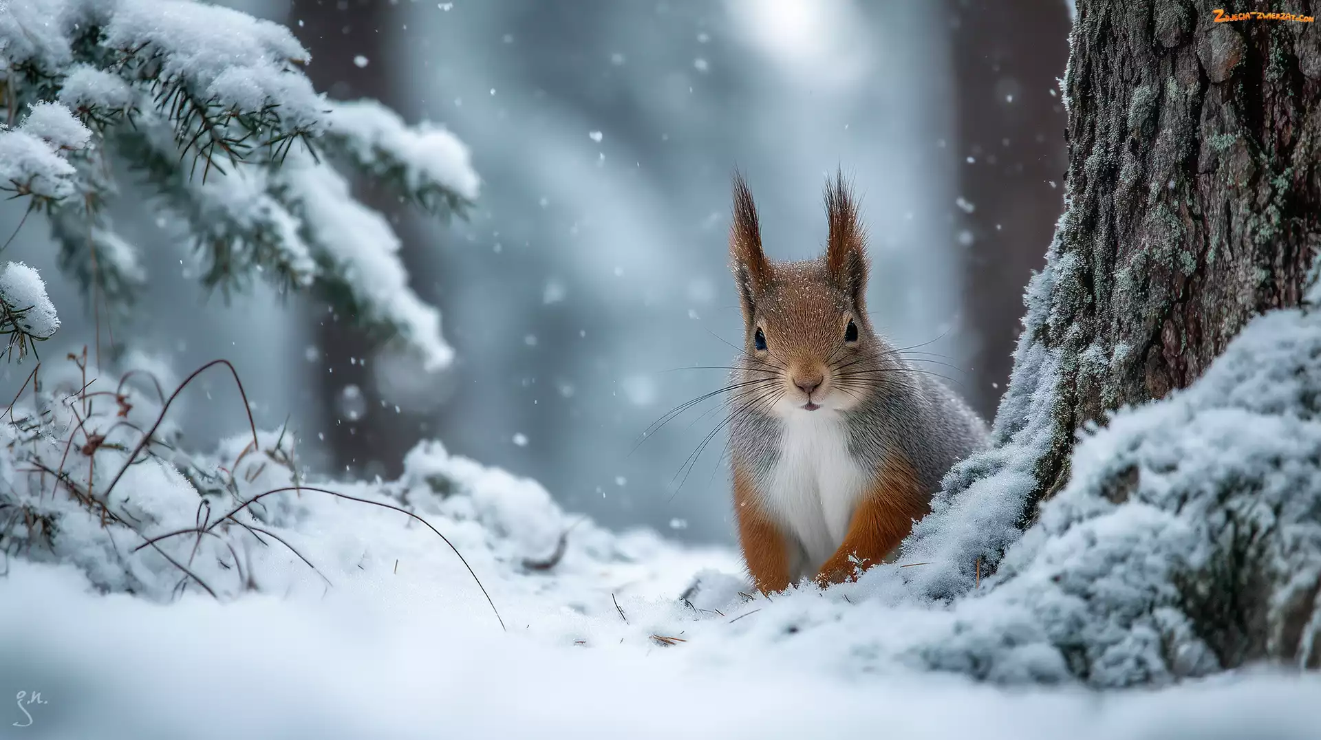 Zdjęcie: Gałązki, Pień, Grafika AI, Wiewiórka, Zima