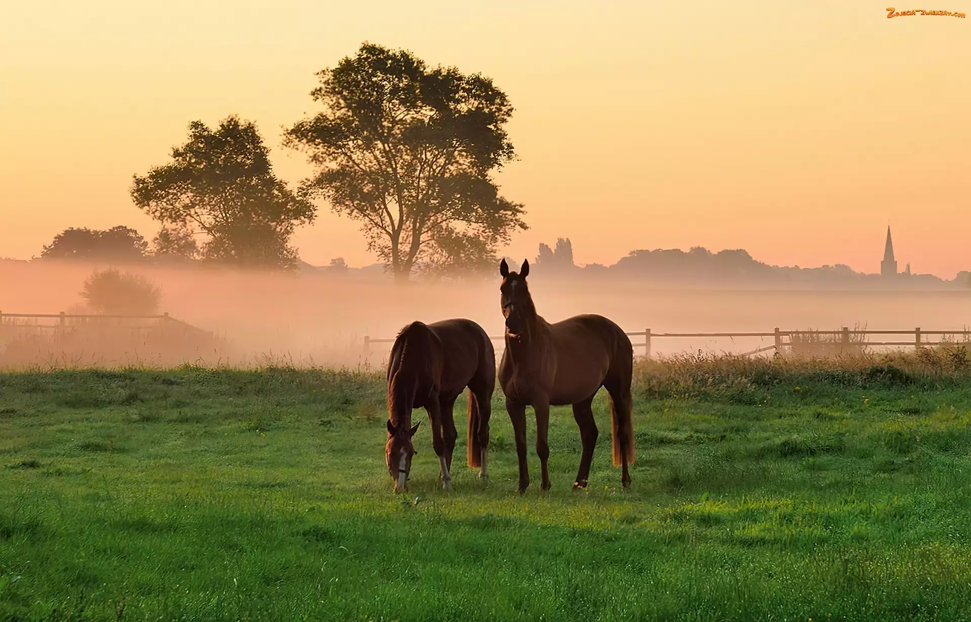 Zdjęcie: Łąka, Dwa, Mgła, Drzewa, Konie, Trawa
