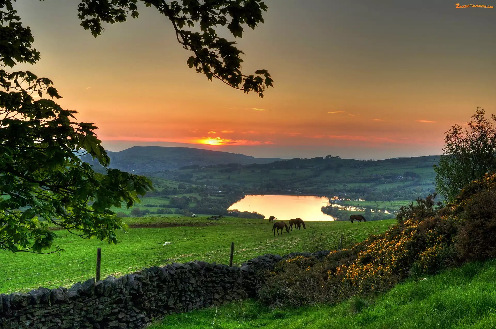 Zdjęcie: Łąki, Rzeka, Słońca, Zachód, Góry, Konie