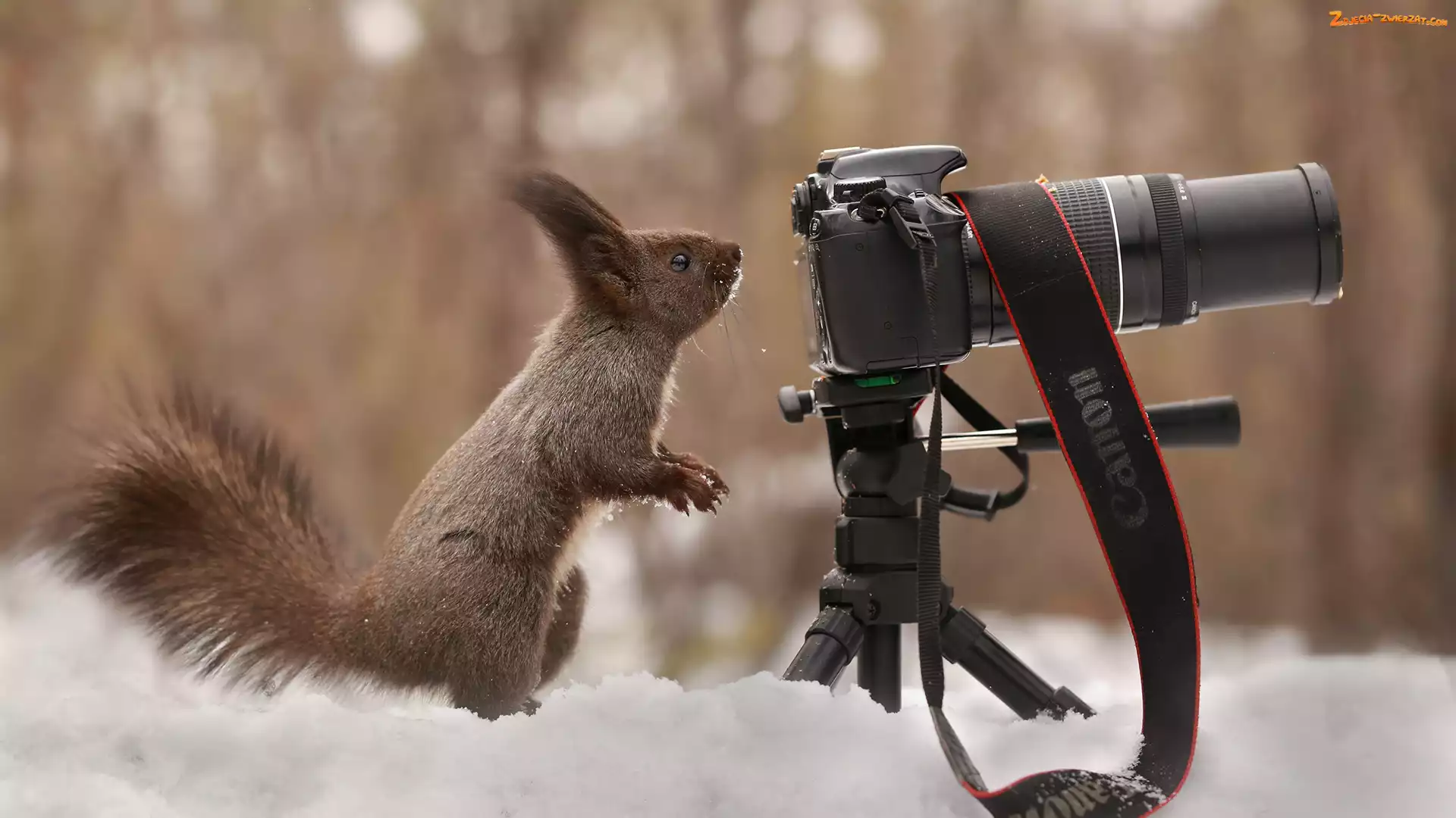 Wiewiórka, Aparat fotograficzny, Zima, Śnieg