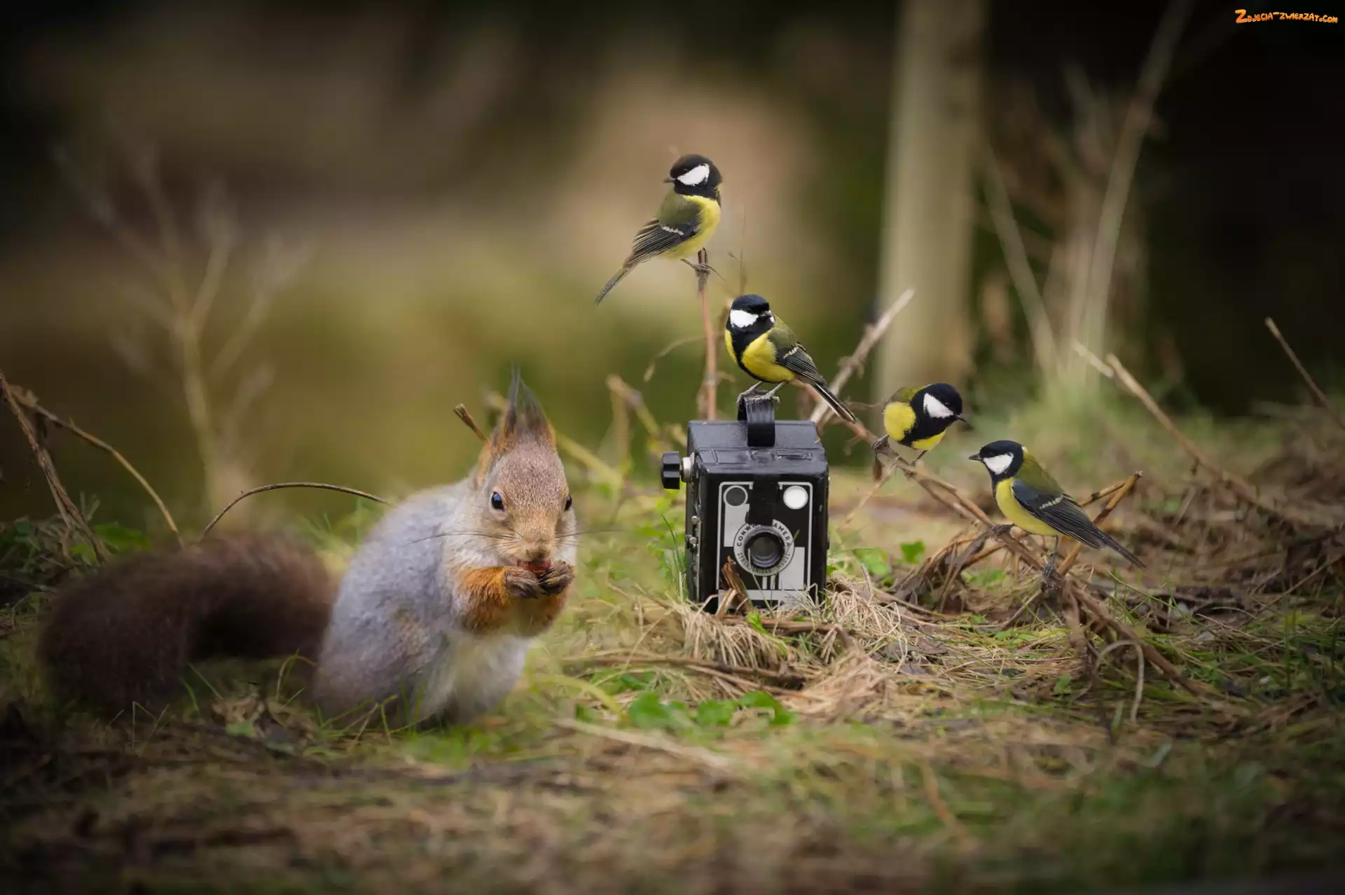 Zdjęcie: Aparat fotograficzny, Wiewiórka, Sikorki