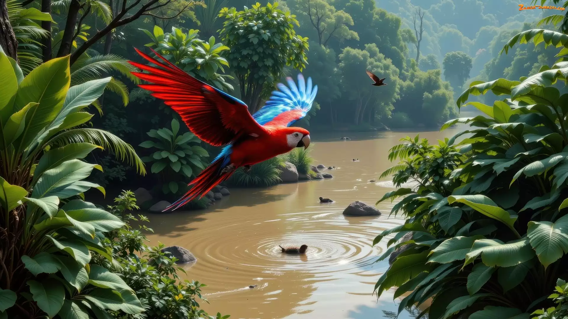 Lot, Rzeka, Fruwająca, Ara, Rośliny, Papuga, Zielone