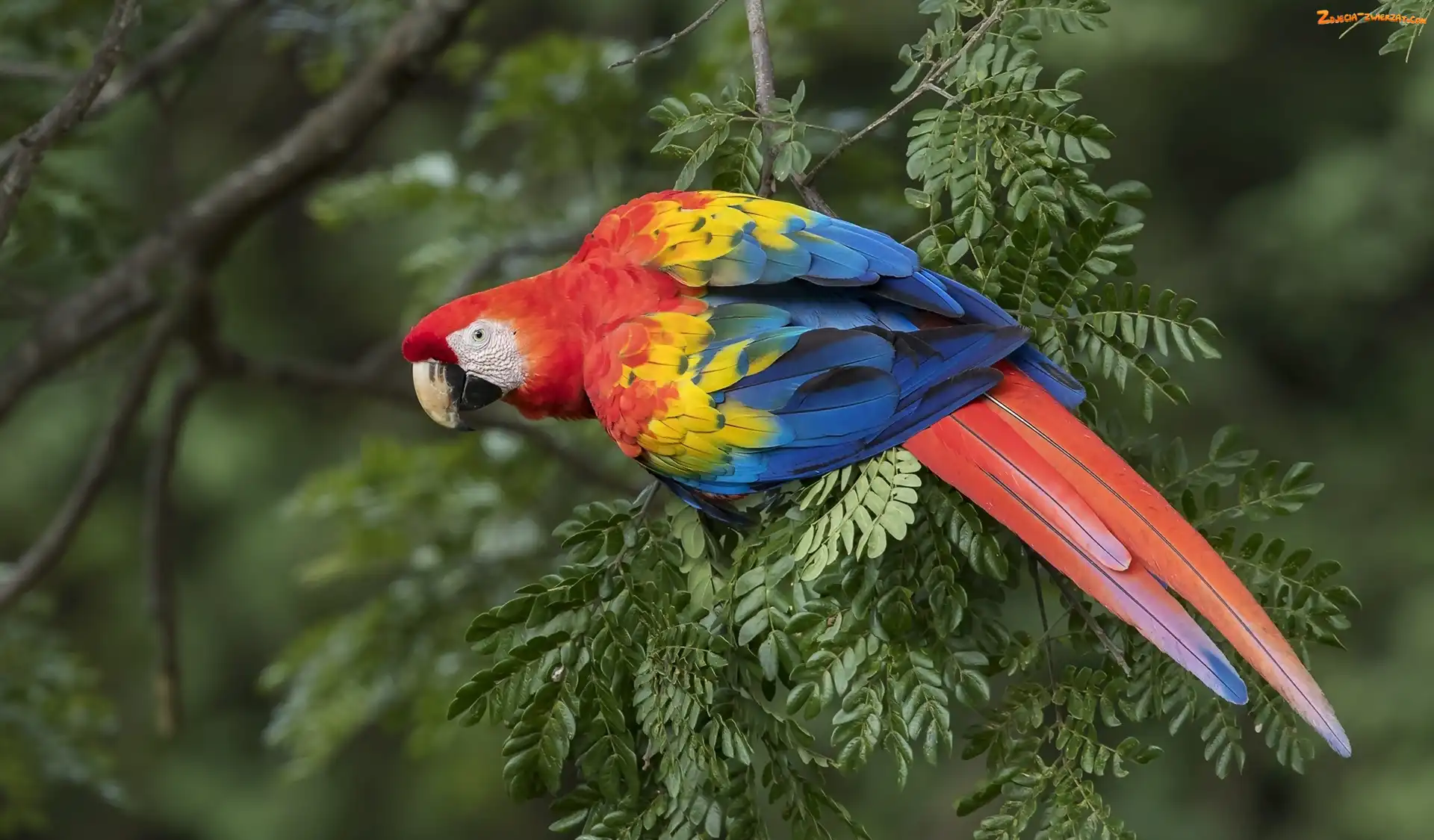 Zdjęcie: Ara żółtoskrzydła, Gałązka, Papuga, Liście