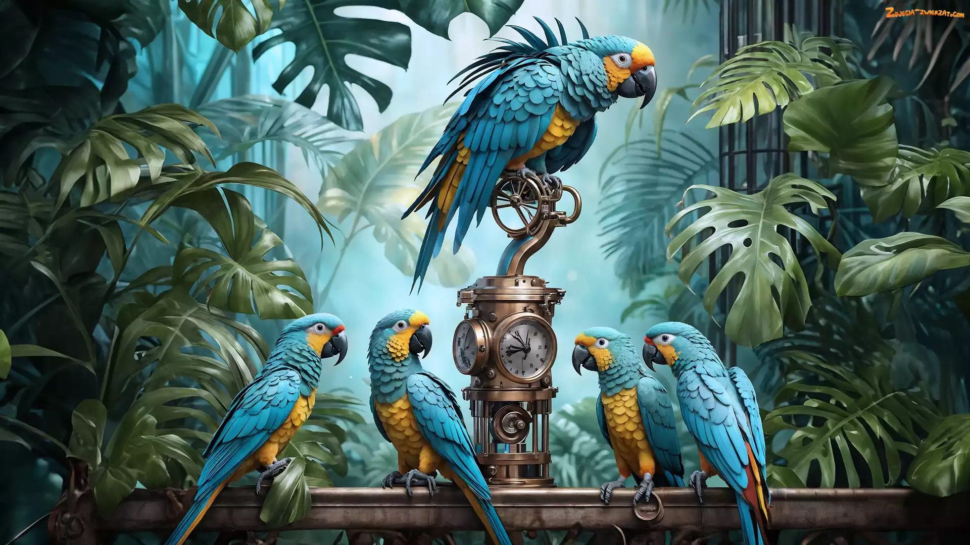 Zdjęcie: Grafika, Barometr, Papugi, Ary, Liście, Monstera
