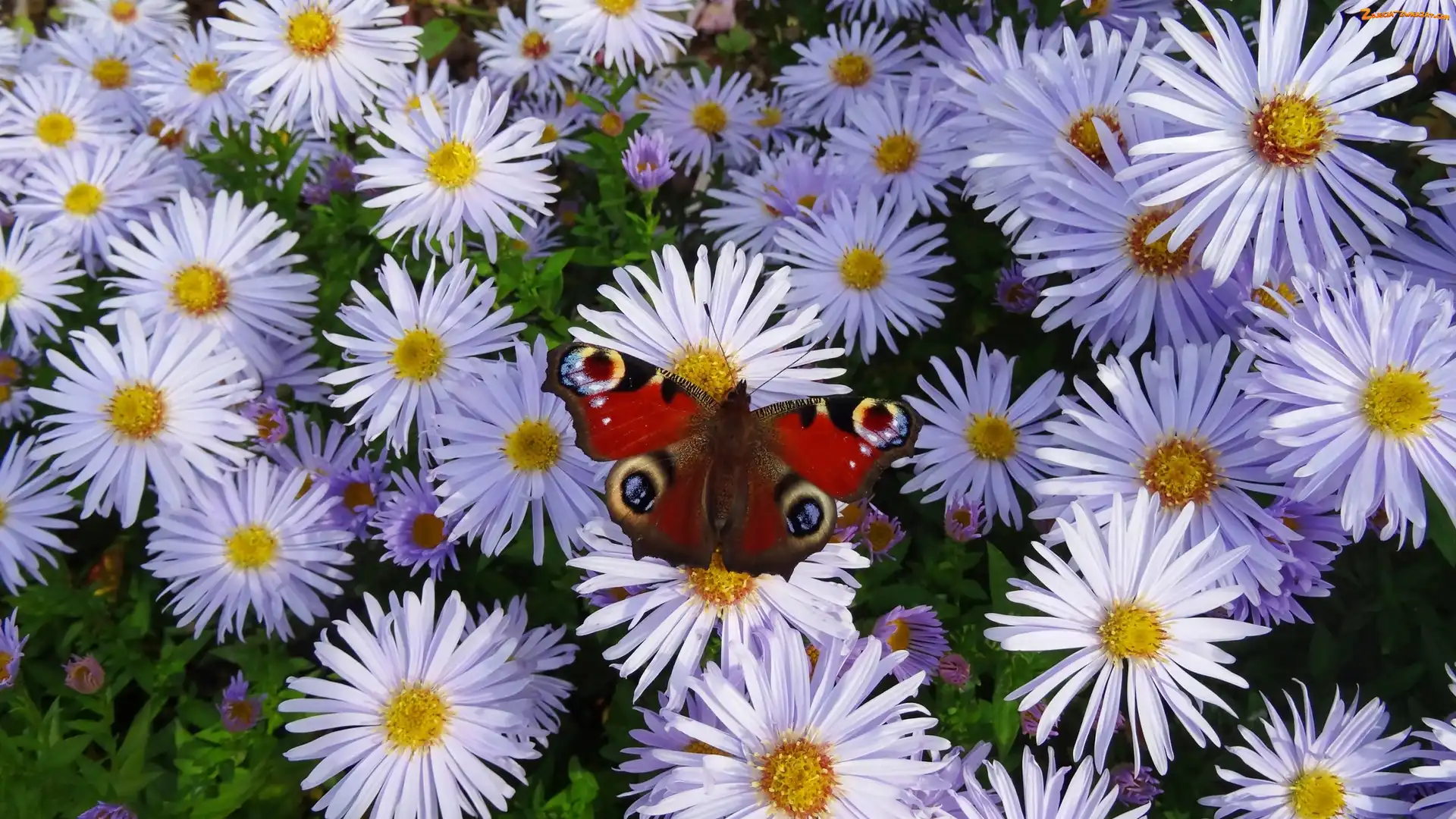 Zdjęcie: Astry marcinki, Rusałka pawik, Kwiaty, Motyl