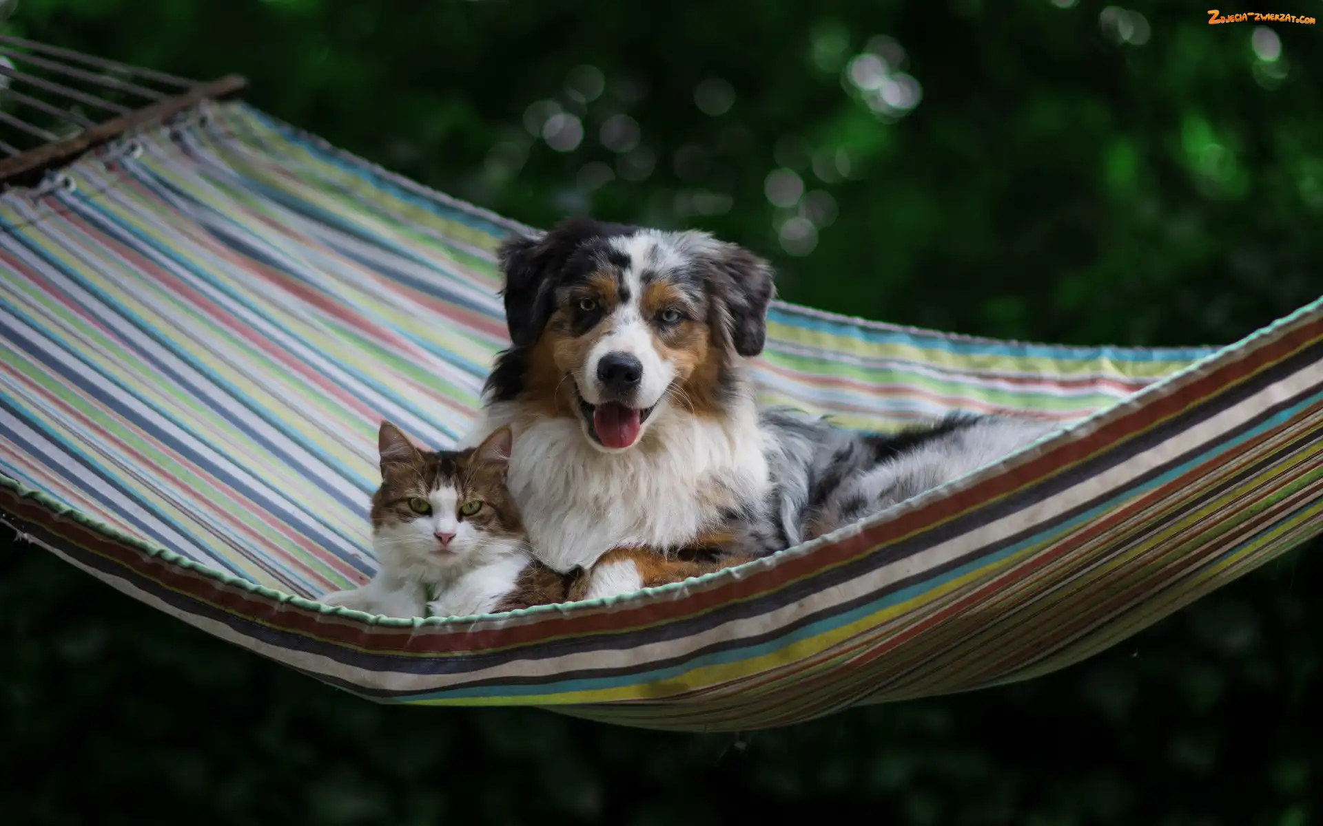 Przyjaciele, Hamak, Owczarek australijski, Kot, Pies