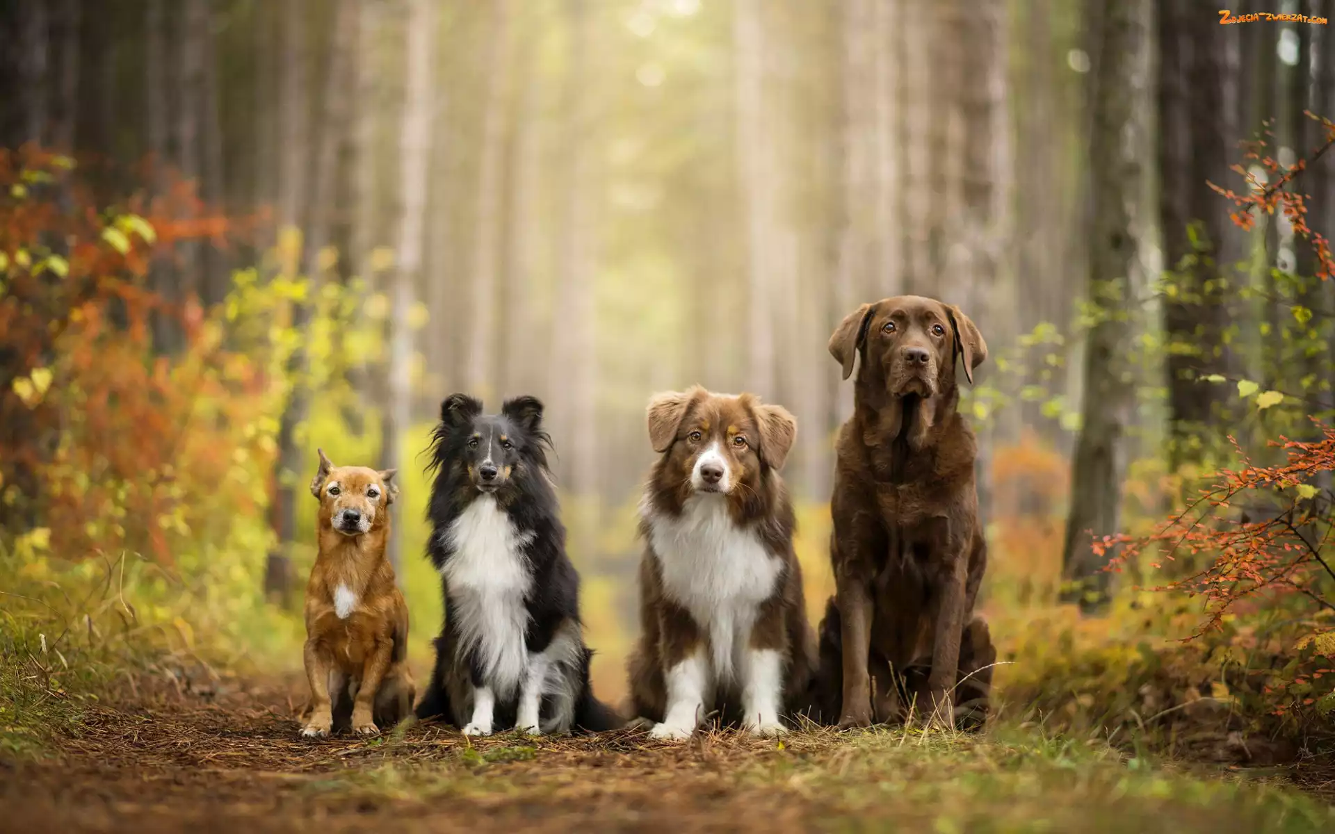 Zdjęcie: Krzewy, Owczarek australijski, Psy, Polanka, Las, Owczarek szetlandzki, Kundelek, Labrador retriever |