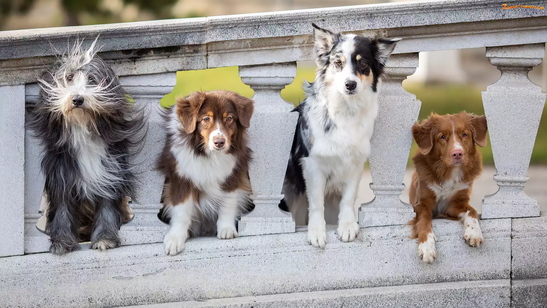 Zdjęcie: Balustrada, Owczarek australijski, Cztery, Kamienna, Retriever z Nowej Szkocji, Owczarek staroangielski Bobtail, Psy, Border collie |