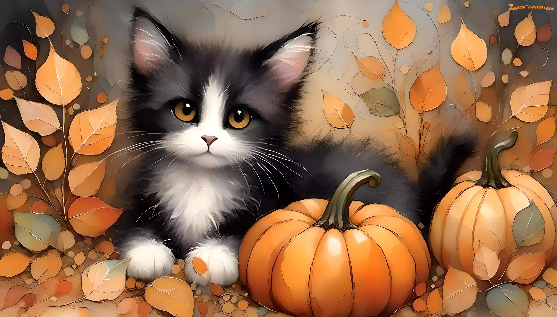 Liście, Dynie, Grafika, Biało-czarny, Kot
