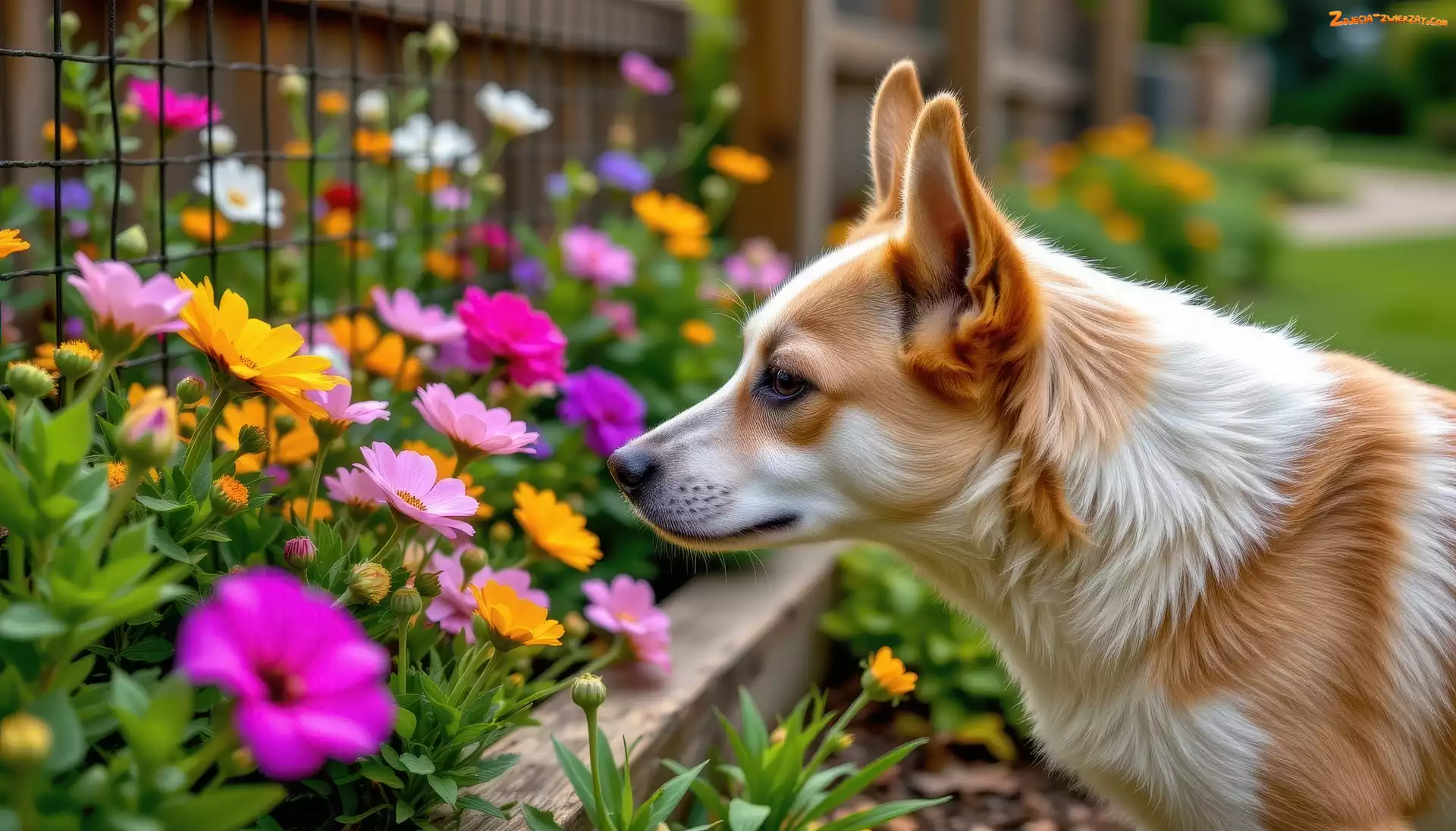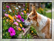 Zdjęcie: Kolorowe, Kwiaty, Ogrodzenie, Biało-beżowy, Pies