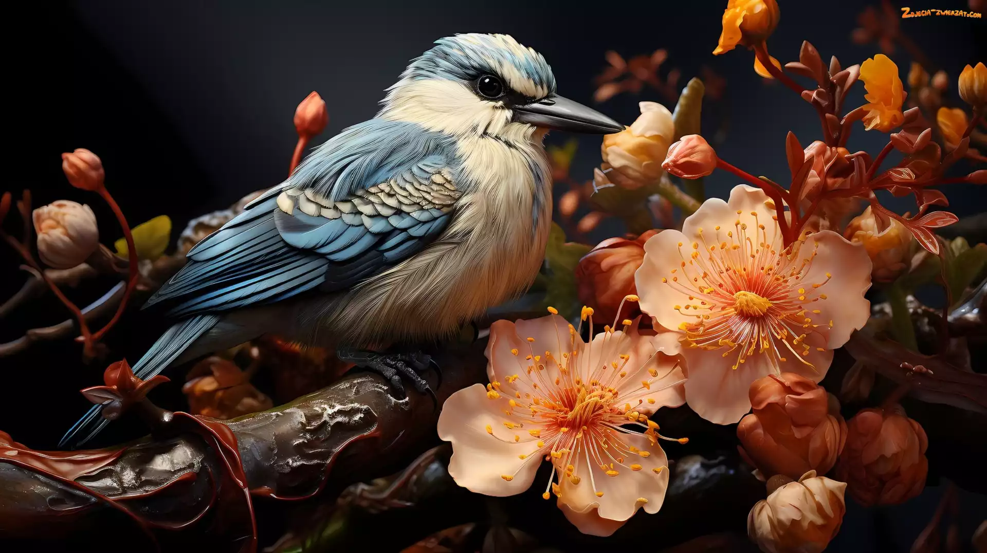 Zdjęcie: Kwitnąca, Gałązka, Grafika, Biało-niebieski, Ptak