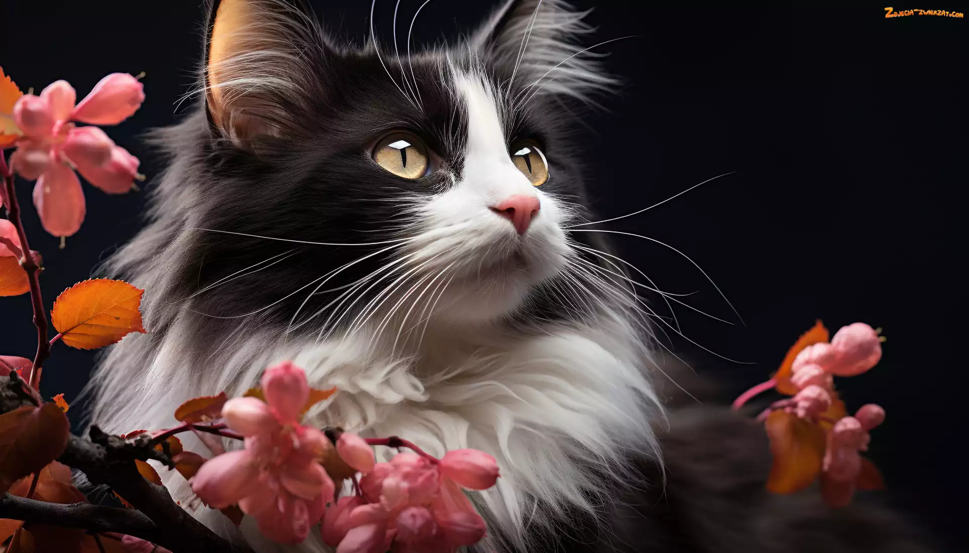 Zdjęcie: Czarno-biały, Kot, Grafika, Kwiaty