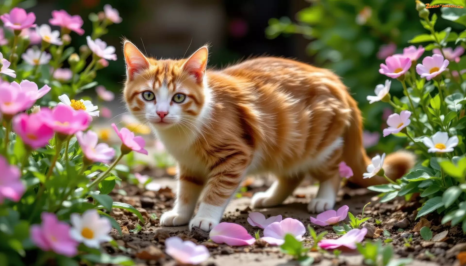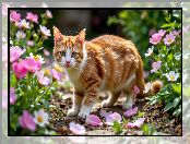 Zdjęcie: Rudo-biały, Kot, Różowe, Kwiaty
