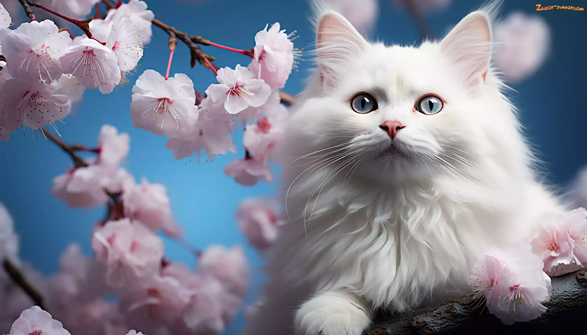 Zdjęcie: Grafika, Drzewo, Kot, Biały, Gałęzie, Kwiaty