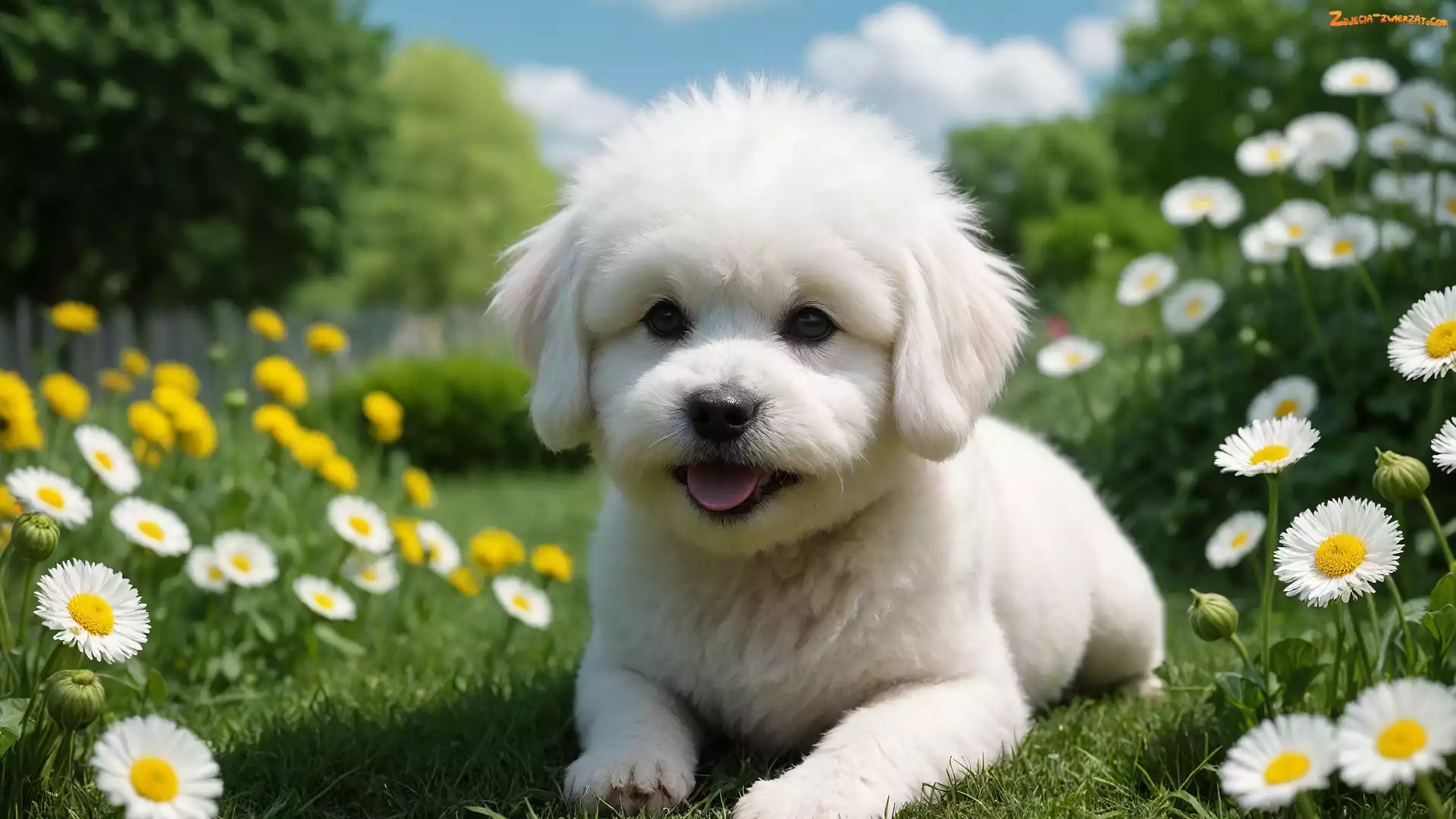 Zdjęcie: Kwiaty, Biały, Łąka, Pies, Szczeniak