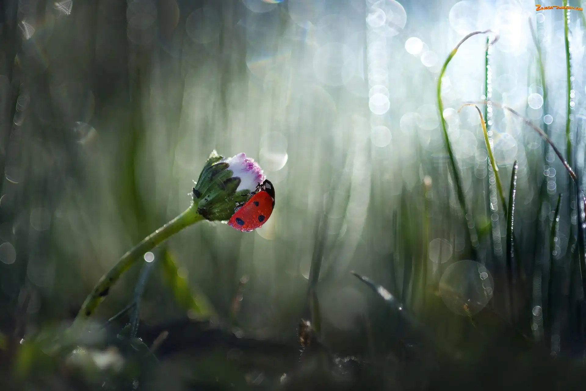 Zdjęcie: Stokrotka, Biedronka, Rozmyte tło, Zbliżenie, Kwiat, Trawa