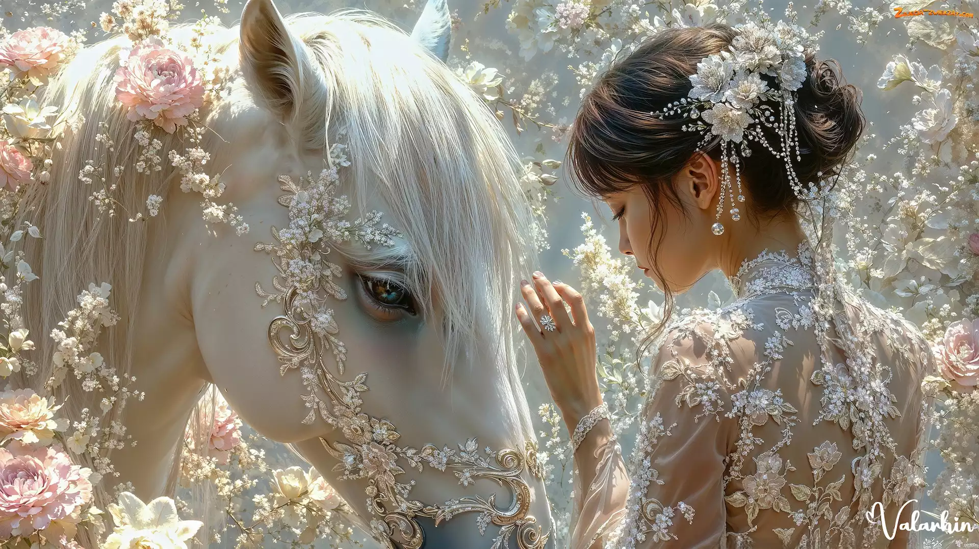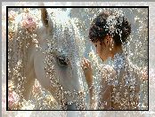 Zdjęcie: Grafika, Biały, Kobieta, Biżuteria, Koń, Kwiaty