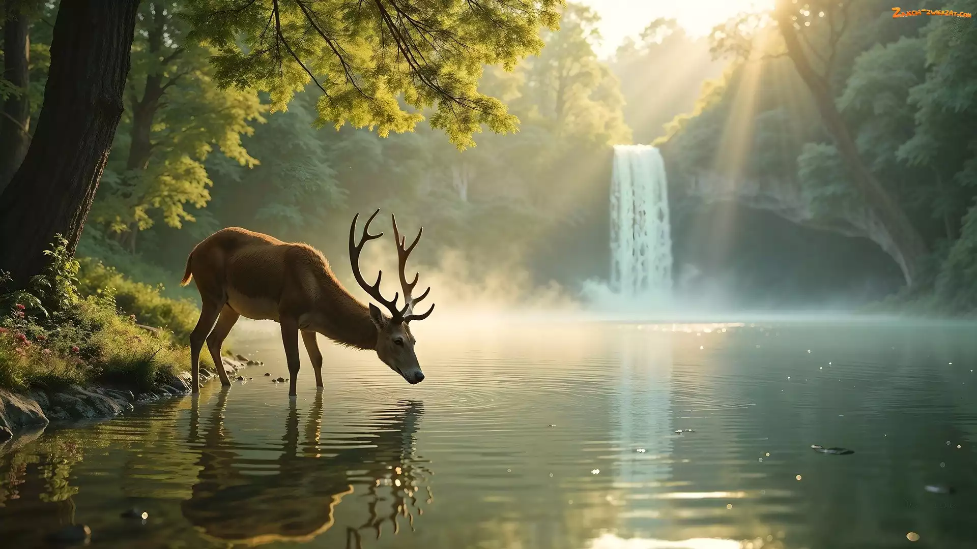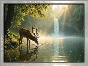 Drzewo, Wodospad, Słoneczny blask, Jeleń, Jezioro