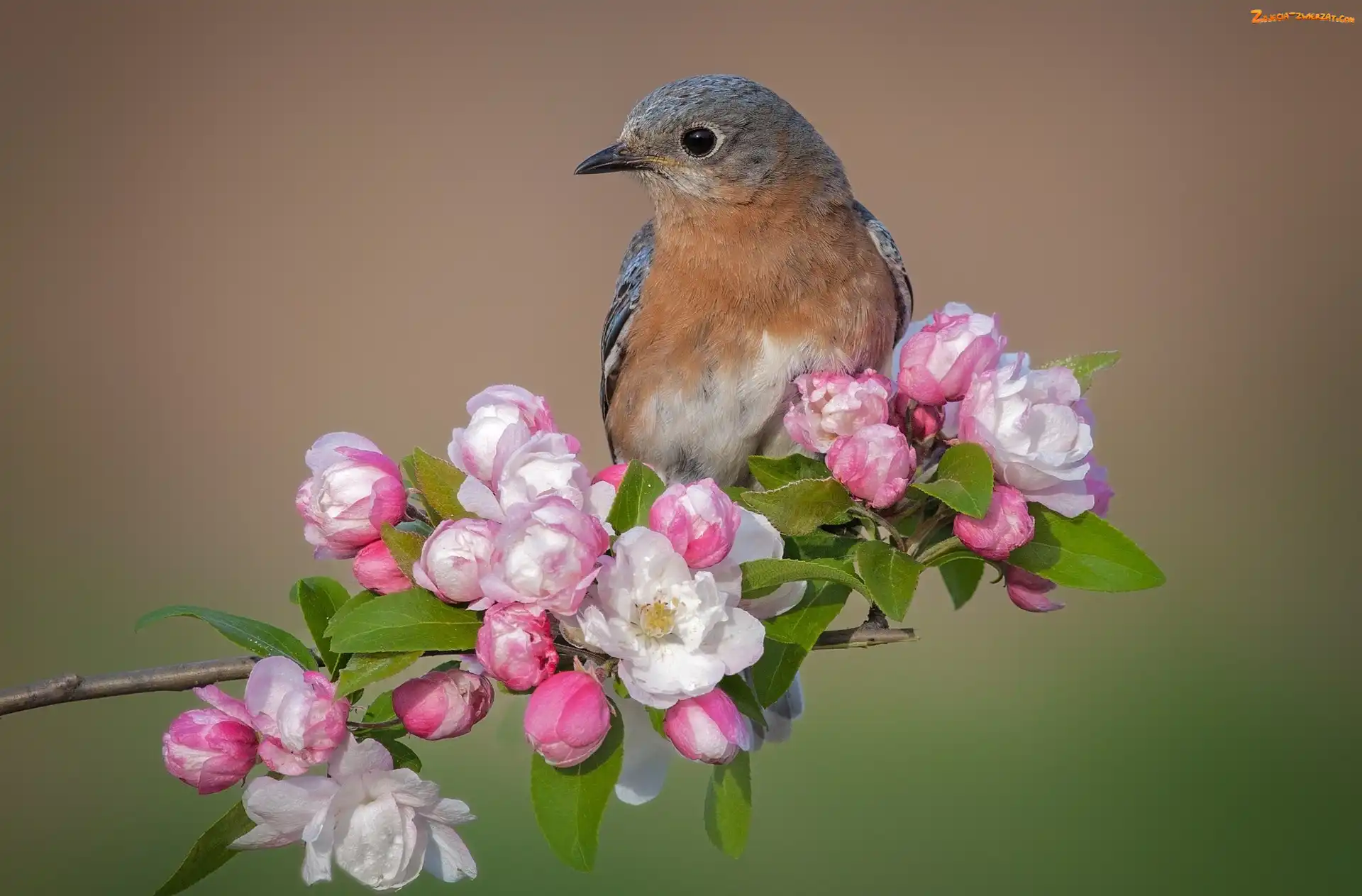Zdjęcie: Błękitnik rudogardły, Kwiaty, Ptak, Gałąź