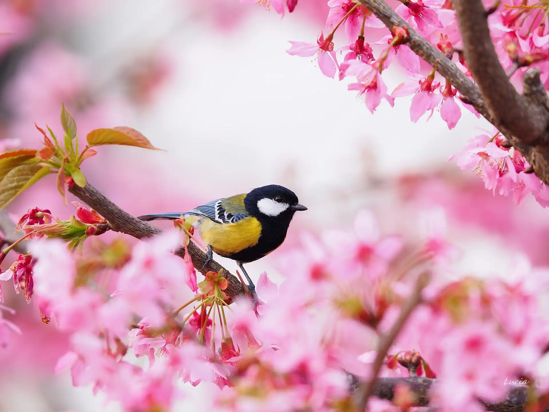 Zdjęcie: Kwiaty, Bogatka zwyczajna, Ptak, Drzewo, Różowe, Sikorka, Kwitnące