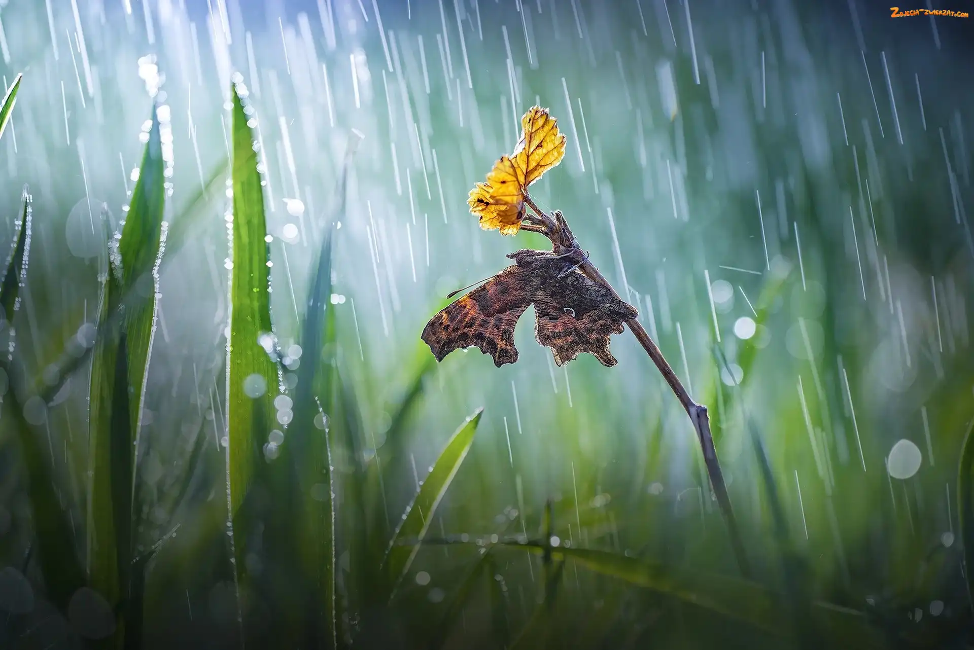 Zdjęcie: Bokeh, Motyl, Gałązka, Trawa, Deszcz