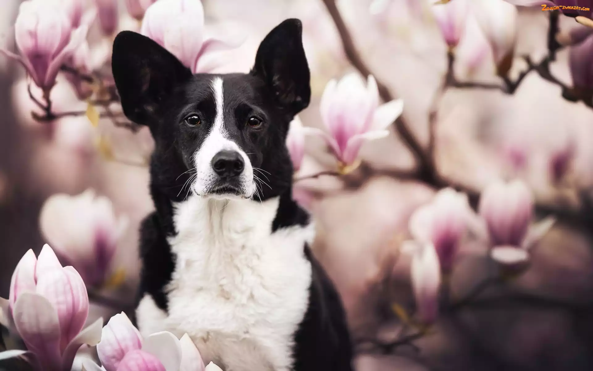 Zdjęcie: Pies, Border collie, Magnolie, Kwiaty
