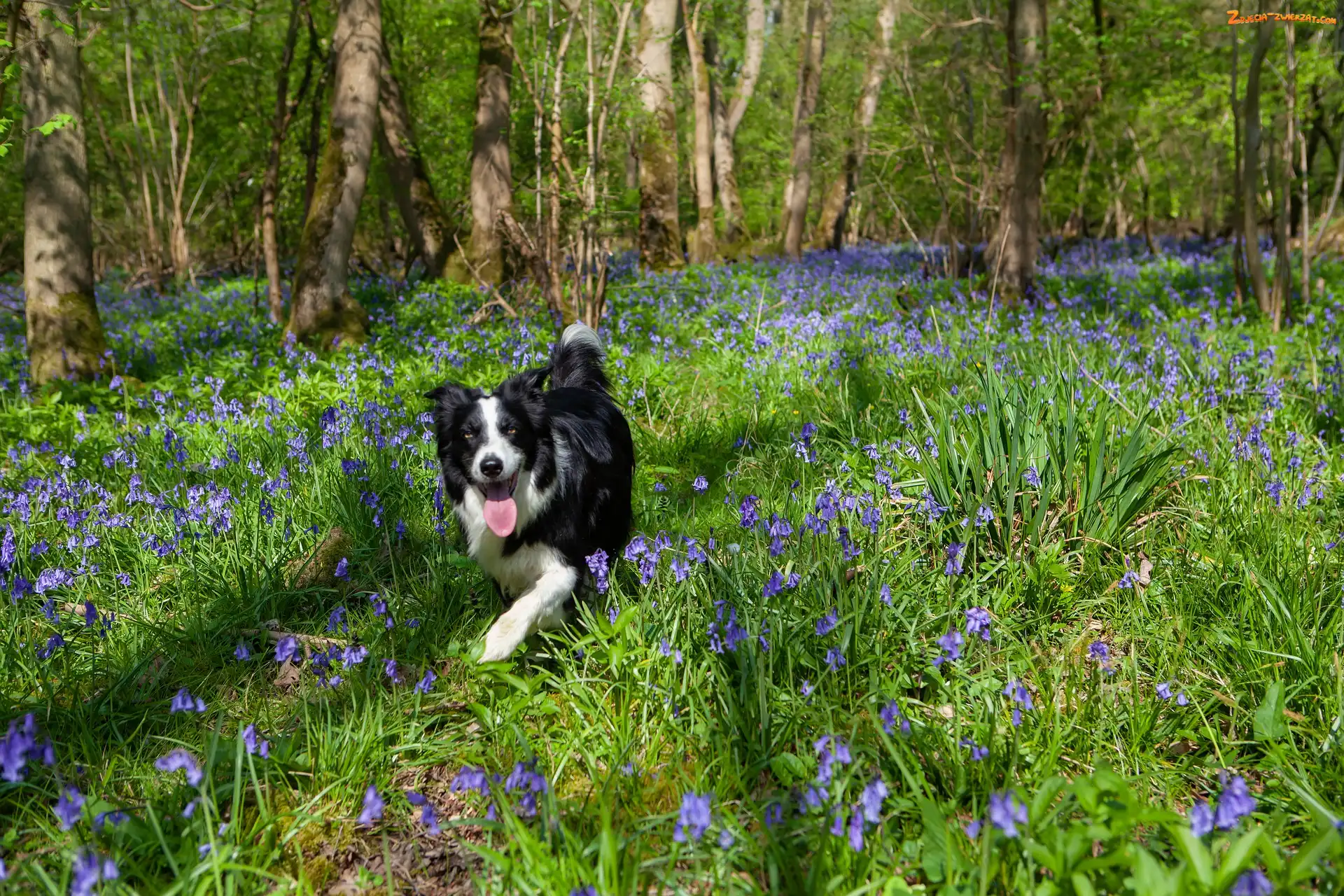 Zdjęcie: Border collie, Pies, Niebieskie, Drzewa, Kwiaty