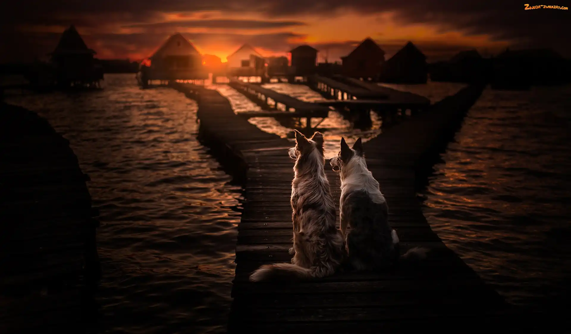 Zdjęcie: Morze, Border collie, Zachód słońca, Pomost, Kładka