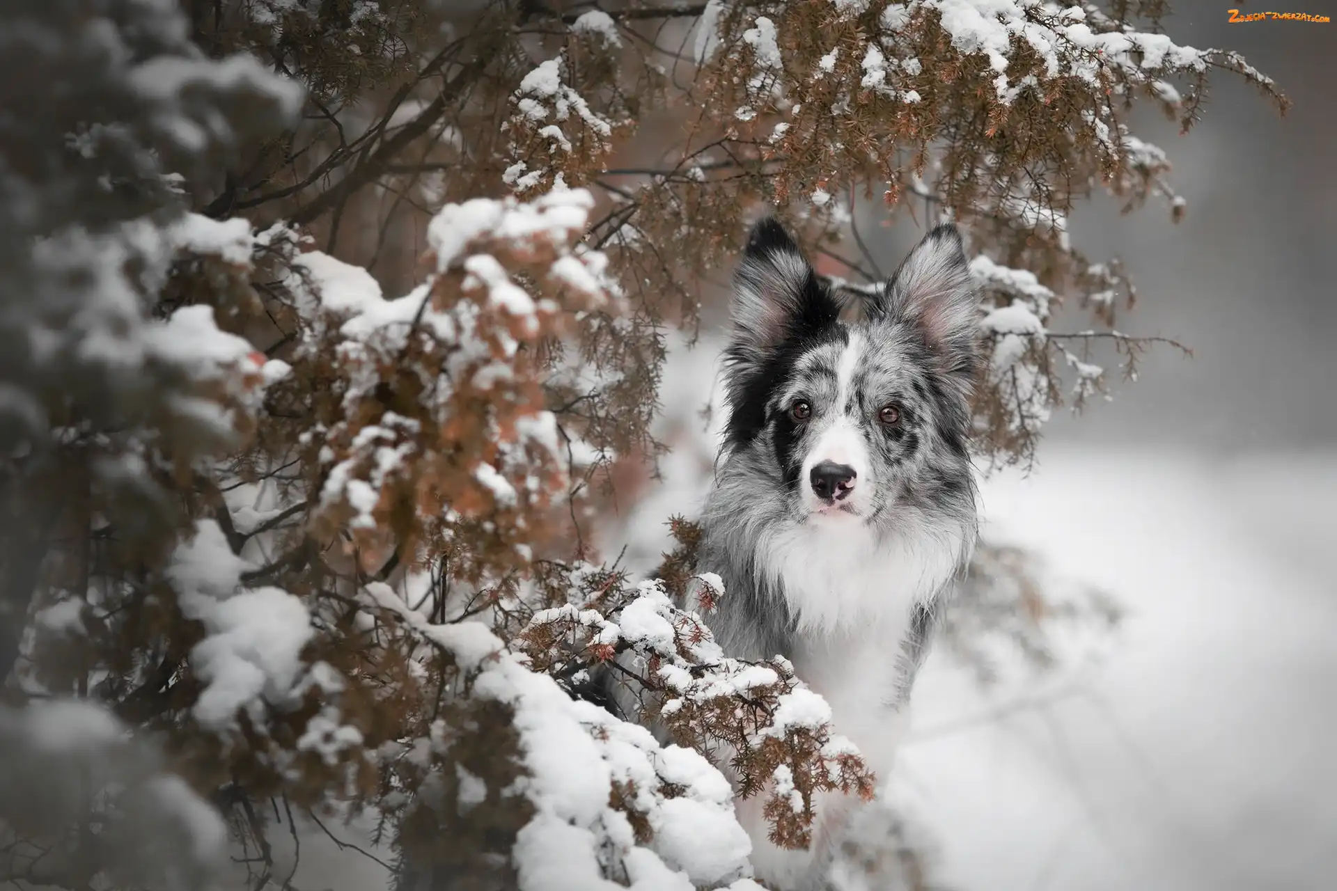 Zdjęcie: Border collie, Gałązki, Pies, Ośnieżone