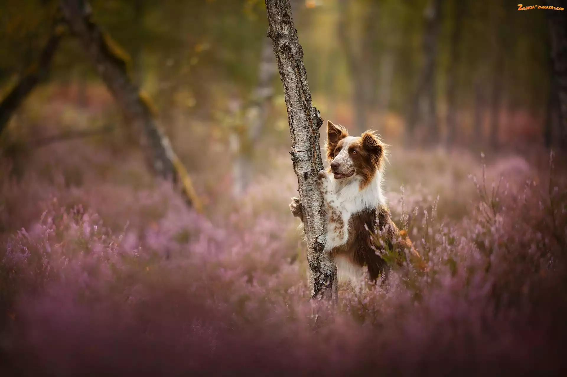 Zdjęcie: Border collie, Wrzosy, Pies, Drzewo