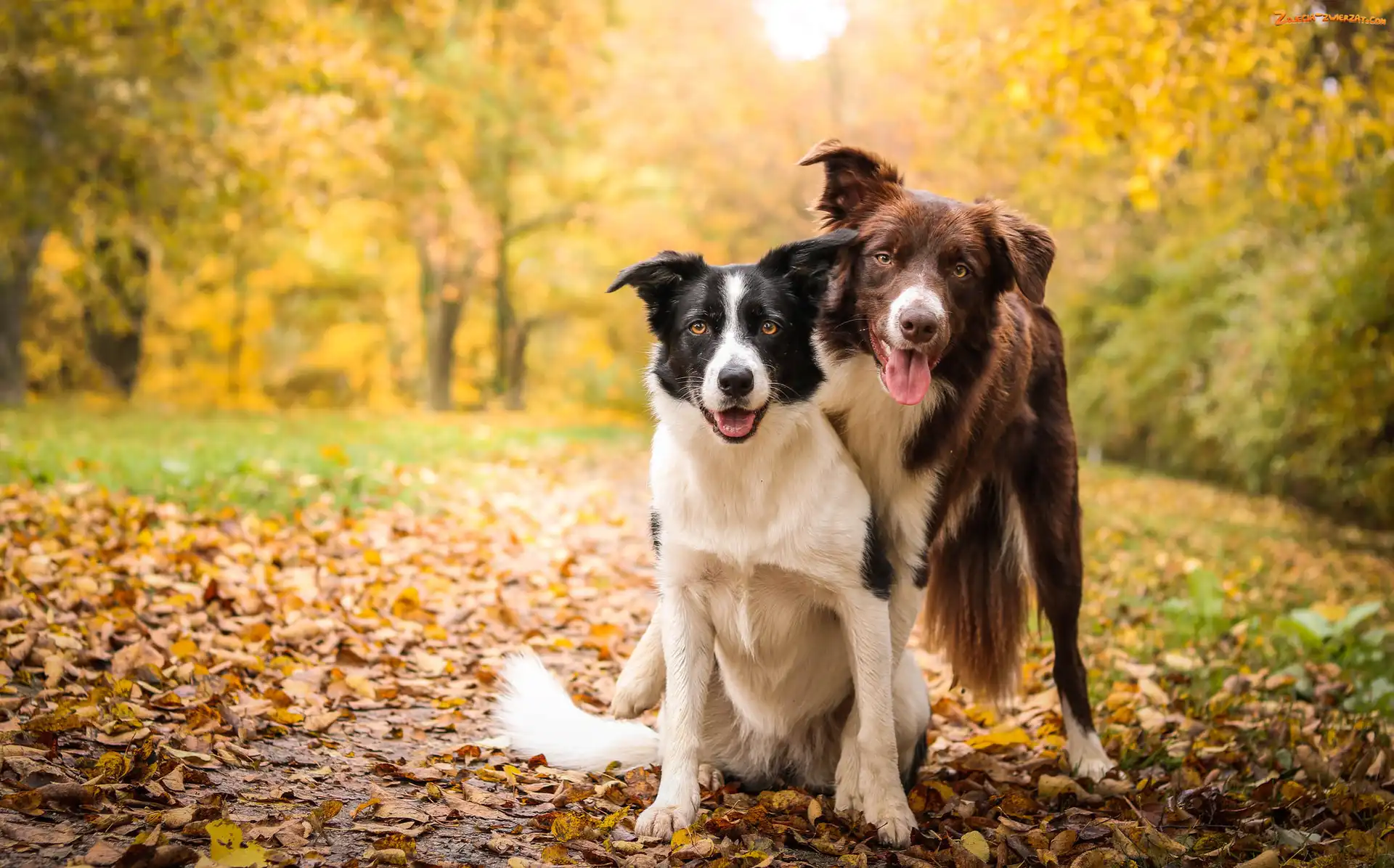 Zdjęcie: Krzewy, Border collie, Dwa, Liście, Drzewa, Psy, Polana
