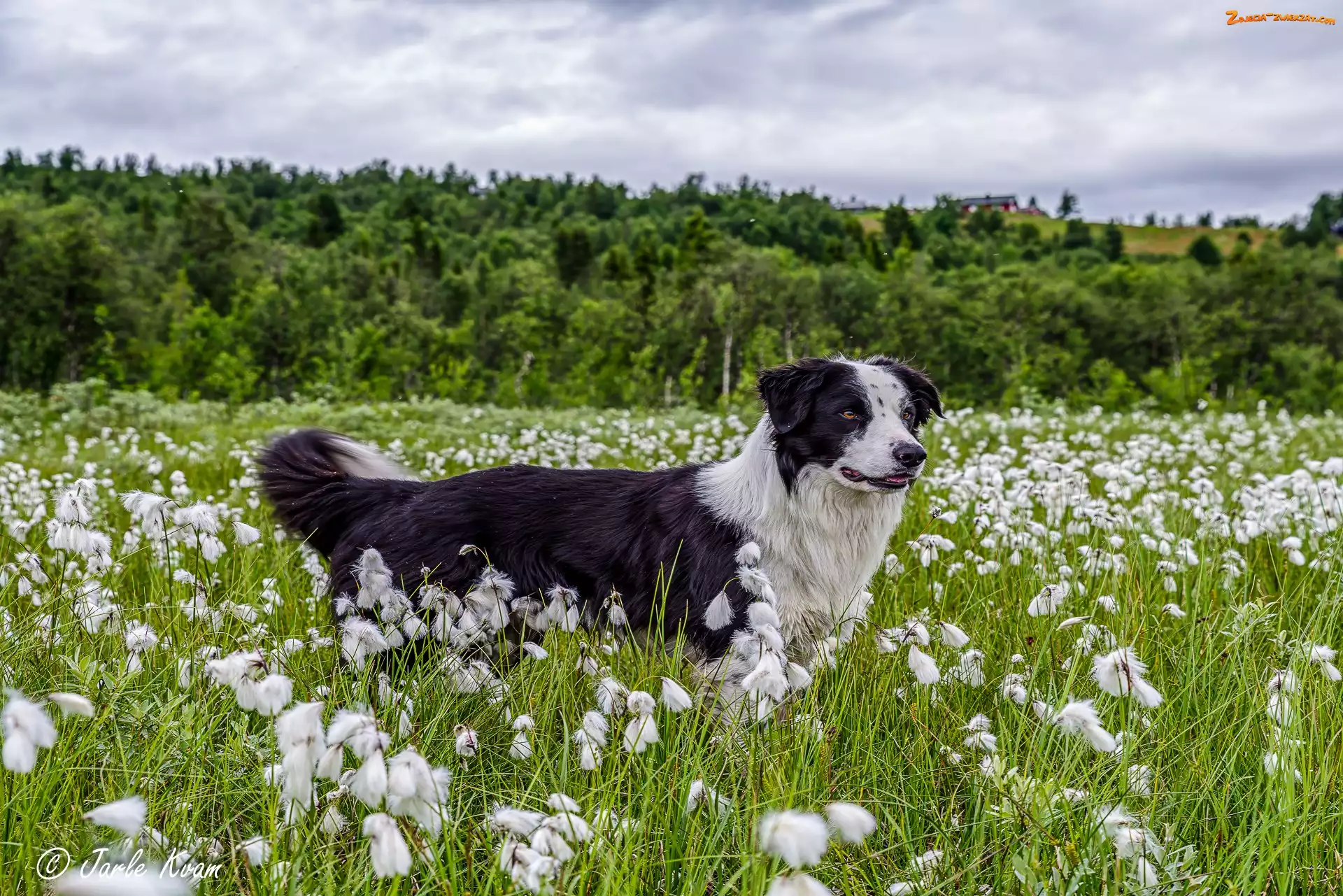 Zdjęcie: Drzewa, Łąka, Pies, Bordier collie, Trawa, Rośliny