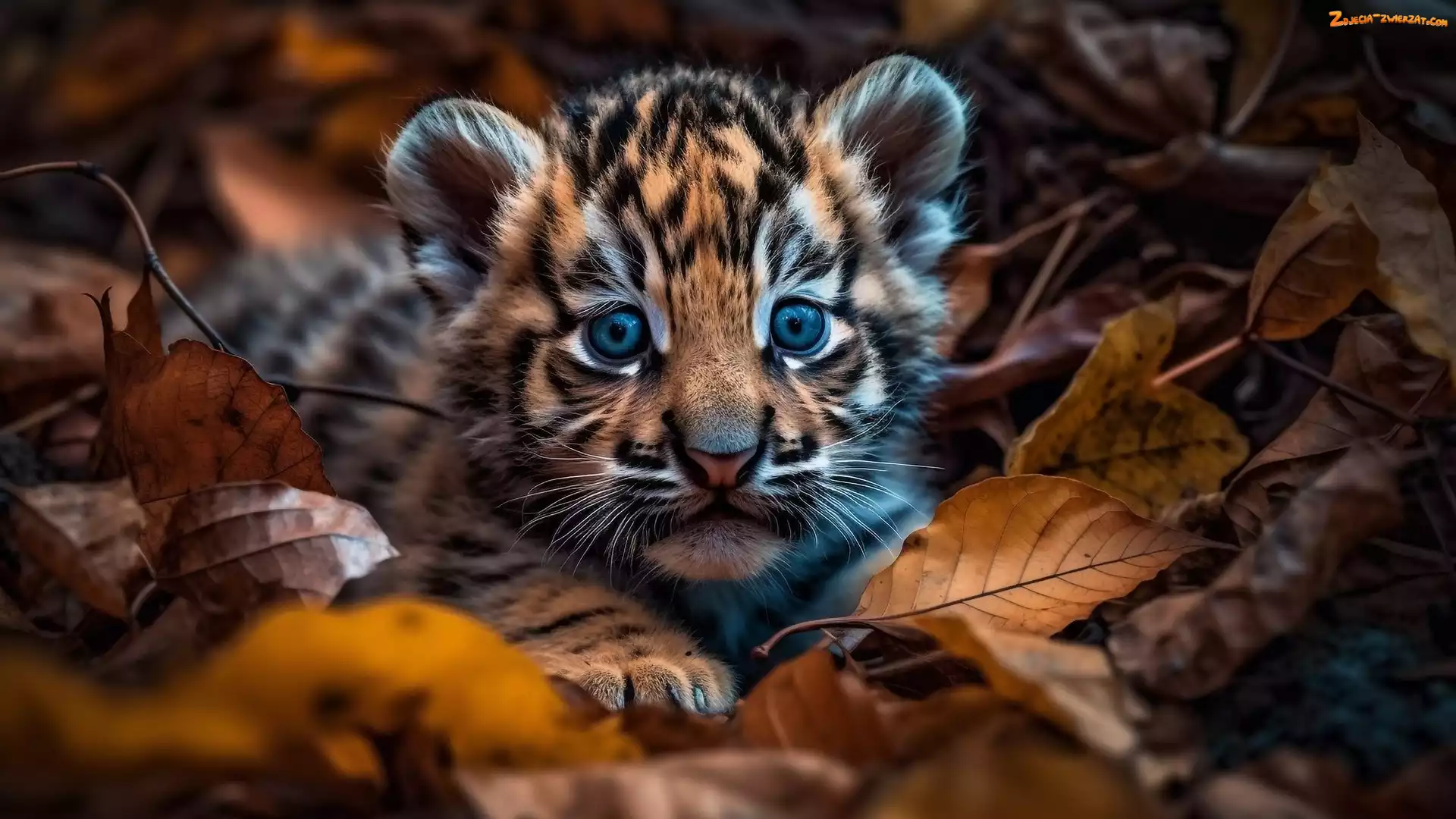 Zdjęcie: Młody, Tygrys, Liście, Brązowe